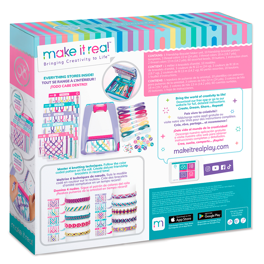 All materials and bracelet patterns store neatly inside the maker. Tweens can use the included 10 friendship bracelet pattern templates or visit makeitrealplay.com to access additional print-out pattern templates and video tutorials for even more fun. This beautiful and time-saving friendship bracelet maker offers the perfect playtime activity for tweens to explore their creativity and show off their style.