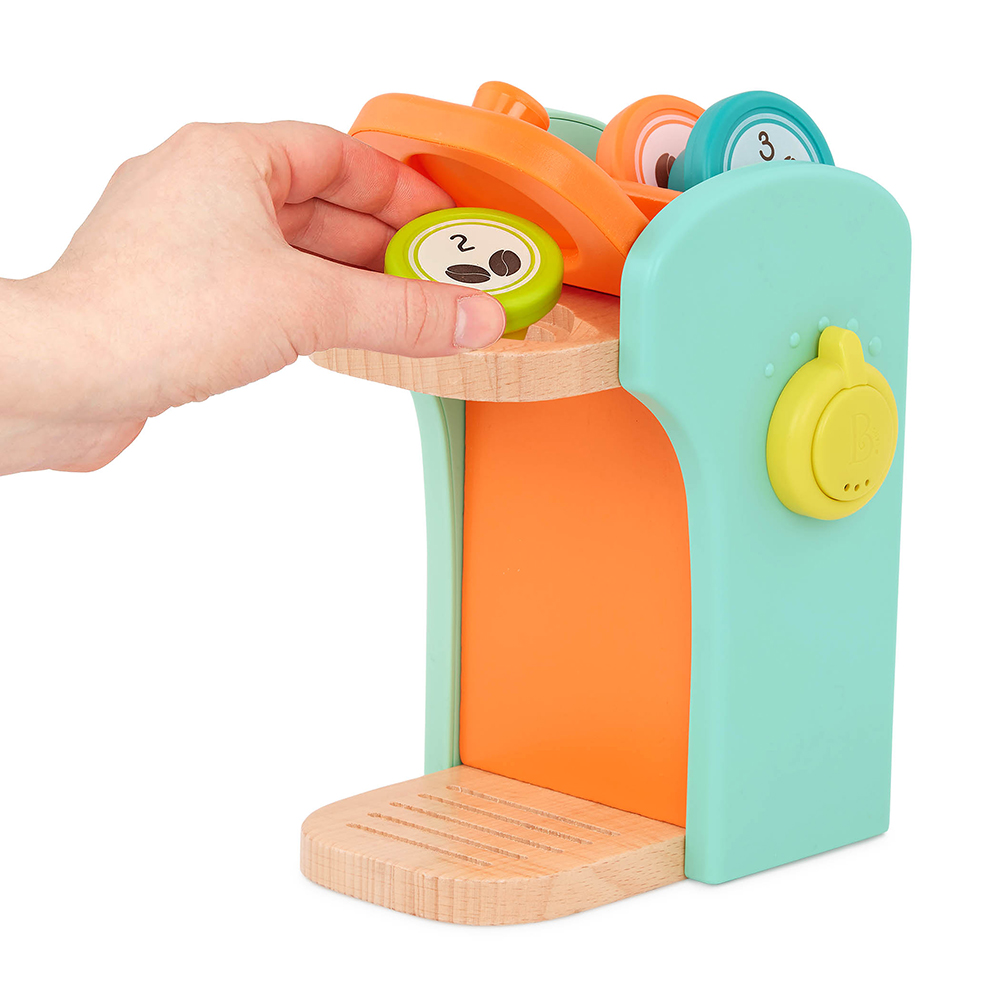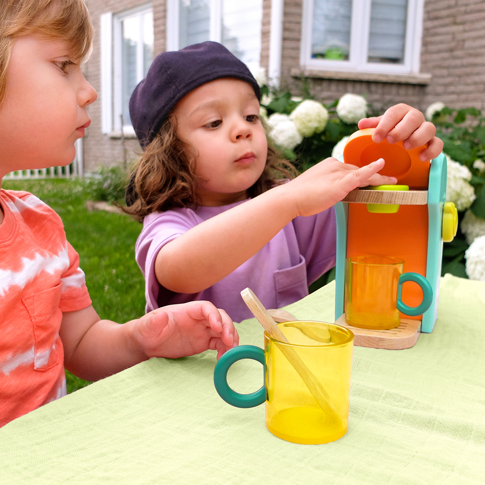 The Café au Play coffee machine set is made with mini baristas in mind! This wooden playset comes with everything toddlers need to make pretend coffee. They can pop in the coffee pods at the top of the machine, place a mug right under, turn the dial to hear realistic sound effects, add milk and sugar, stir it all up with a spoon, and enjoy a coffee with a croissant! Not to mention that kids can easily make coffee for two – this set comes with 2 mug and spoon sets. And when the coffee shop closes for the day, children can also store some of the accessories right in the back of the machine to keep things neat and tidy. The Café au Play set is crafted with smooth and durable wooden parts, features tiny hands-friendly pieces, and is great for hours and hours of pretend play! Recommended for kids 2 years and over.
