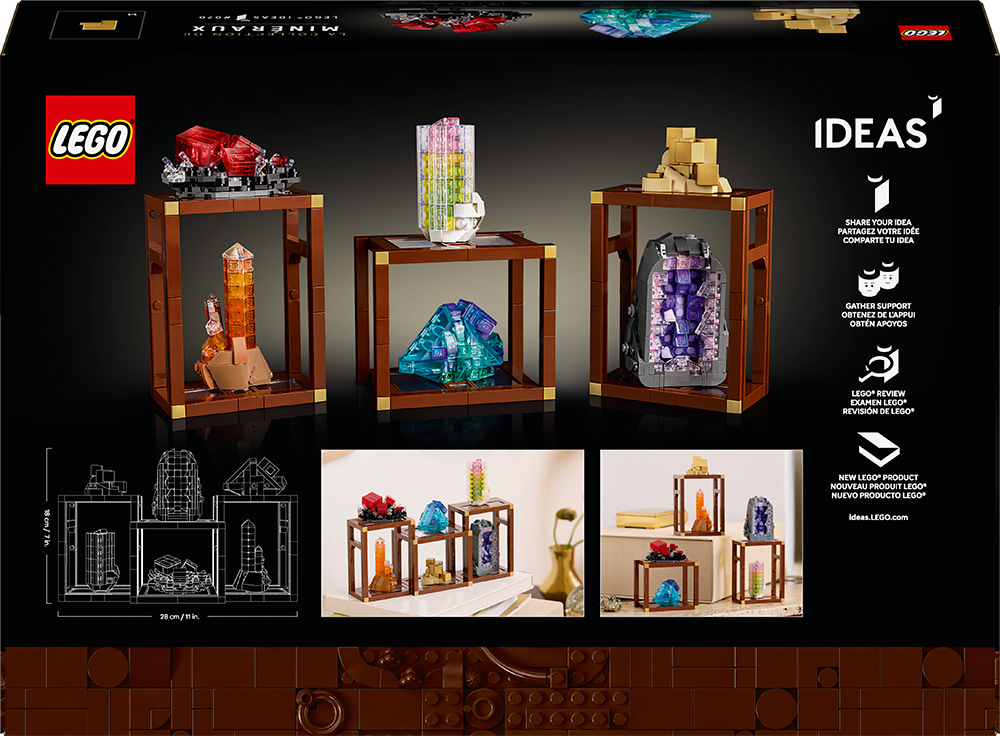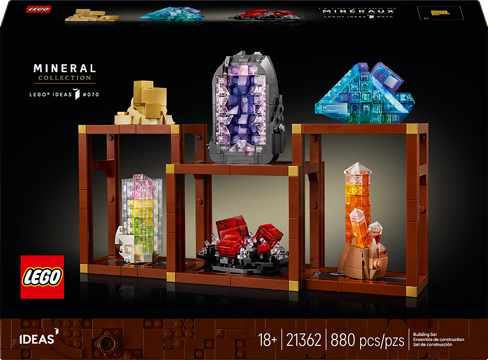 Create your own brick-built mineral collection. Use clever building techniques and transparent LEGO bricks to replicate the sparkling beauty of minerals. Build LEGO models of golden pyrite, purple amethyst, reddish-pink rhodochrosite, blue fluorite, watermelon tourmaline and tangerine quartz. Arrange the minerals on the 3 shelving units to complete a stunning display.