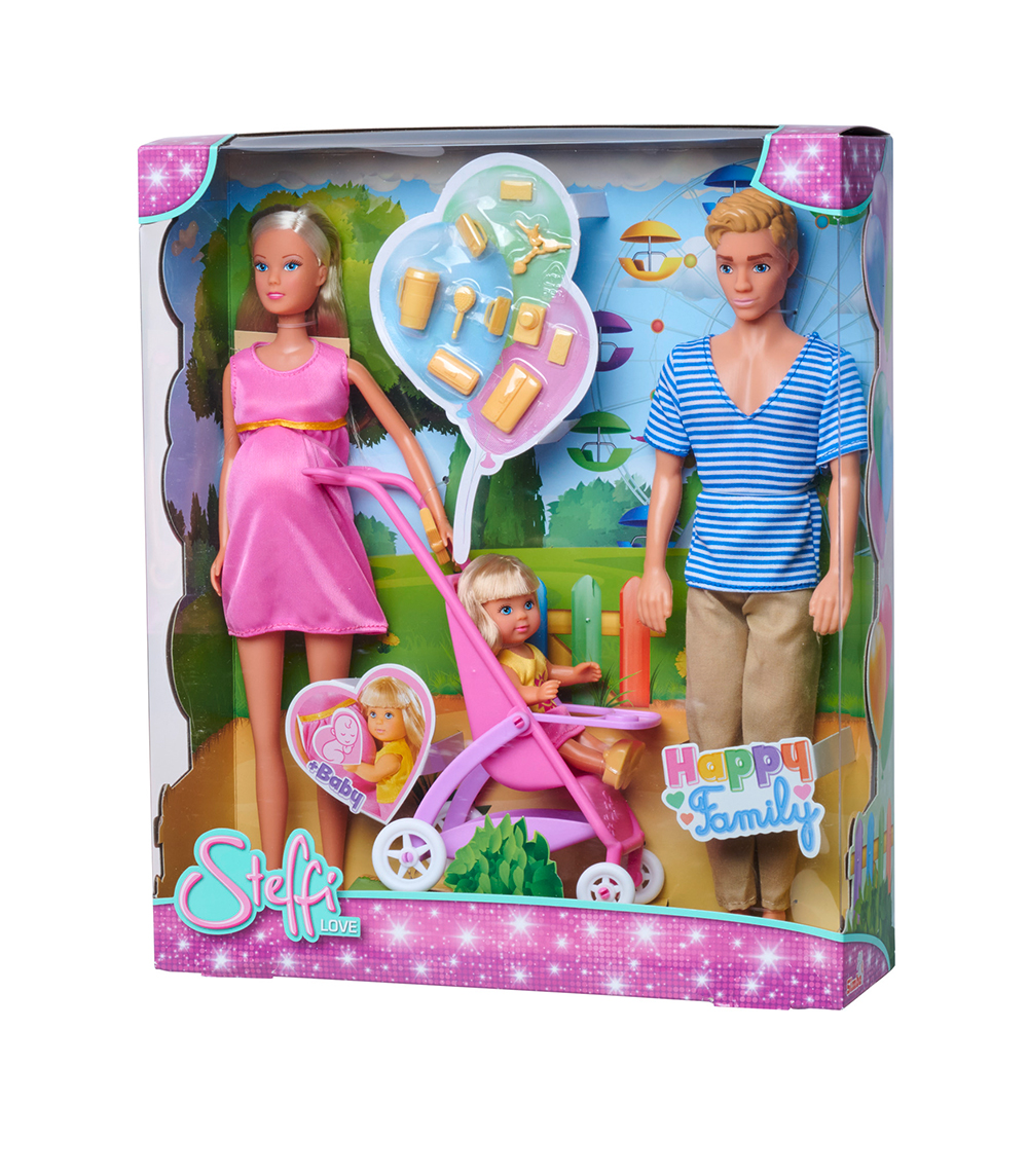 Discover the happy Steffi Love family! This set includes a pregnant Steffi, Kevin, Evi, a baby with stroller and 11 accessories. The family members measure 30 cm, 29 cm, 12 cm and 4 cm respectively. Immerse yourself in hours of imaginative play with this adorable family and its complete accessories.