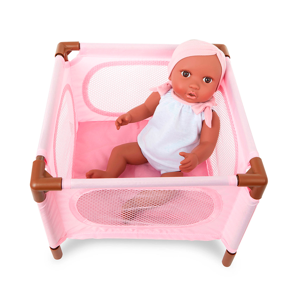 Un ensemble 3-en1 pour votre poupée Babi comprenant un parc portable, une jolie chaise haute et une poussette de jogging.