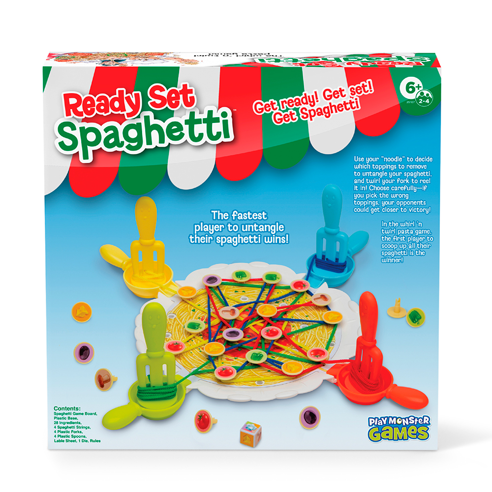 Installez la planche avec toutes vos ficelles et enfoncez-y les ingrédients. Ensuite, utilisez le dé pour décider quelles garnitures retirer de l'assiette de spaghettis afin de démêler vos spaghettis et de faire tourner votre fourchette pour les enrouler. Choisissez avec soin : si vous choisissez les mauvaises garnitures, vos adversaires pourraient se rapprocher de la victoire! Dans le jeu de pâtes tourbillonnantes, le premier joueur à ramasser tous ses spaghettis est le gagnant!