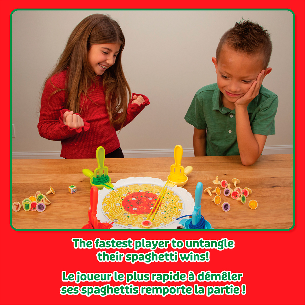 Set up the board with all your string and press in the ingredients. Then, use the dice to decide which toppings to remove from the spaghetti plate in order to untangle your spaghetti and twirl your fork to reel it in. Choose carefully—if you pick the wrong toppings, your opponents could get closer to winning! In the whirl 'n twirl pasta game, the first player to scoop up all their spaghetti is the winner!