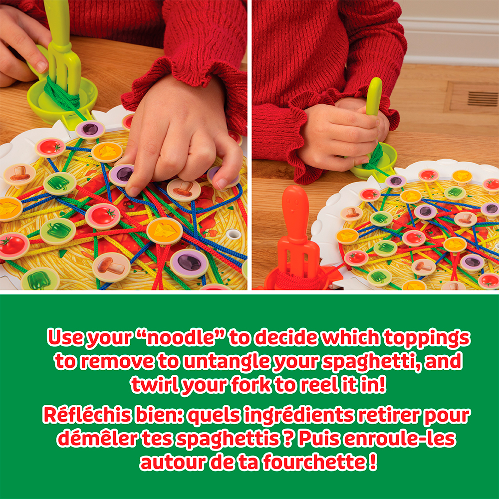 Set up the board with all your string and press in the ingredients. Then, use the dice to decide which toppings to remove from the spaghetti plate in order to untangle your spaghetti and twirl your fork to reel it in. Choose carefully—if you pick the wrong toppings, your opponents could get closer to winning! In the whirl 'n twirl pasta game, the first player to scoop up all their spaghetti is the winner!