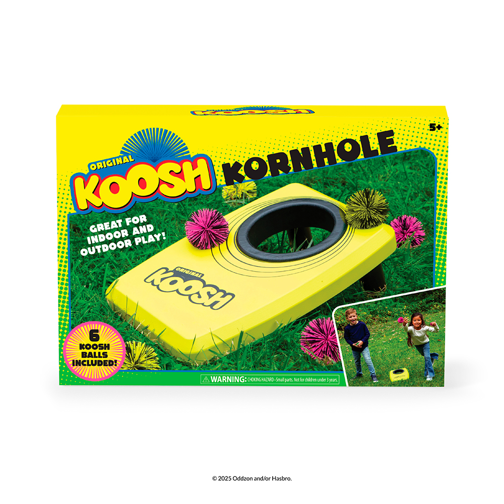 Koosh Kornhole is the classic game of cornhole (or bags!) with bright, neon Koosh balls. Play like the classic game, but with soft balls that are easy to throw. Throw your Koosh balls at the board to try and score points! The board is lightweight and perfect for kids, and can easily be set up outside or inside, as the soft Koosh balls don't damage floors or ceilings! Everything you need for a game of cornhole is ready in the box, just easily pop on the board's legs and get playing! This board is perfect for kids aged 6 and over, who can set it up and play on it.