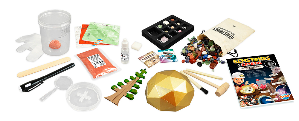 Deviens un expert des pierres précieuses et des cristaux avec les 27 pierres authentiques incluses. Réalise des expériences pour découvrir leurs propriétés. Avec les outils, déterre 8 véritables pierres brutes. Trouve leurs versions polies dans le sac (300 g) et compare-les avec la loupe.