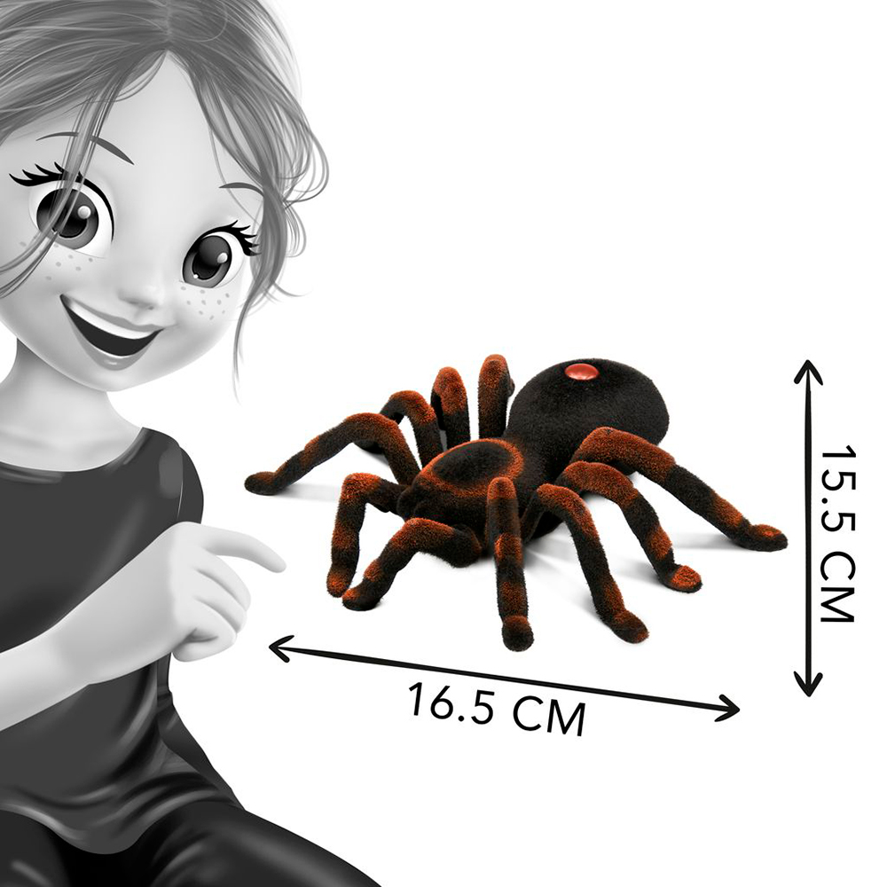 A radio-controlled tarantula accompanied by a booklet for learning and fun! The remote control has a range of 7.5 meters and allows you to steer the spider in four directions: forward, backward, left, and right. The spider's legs are articulated.