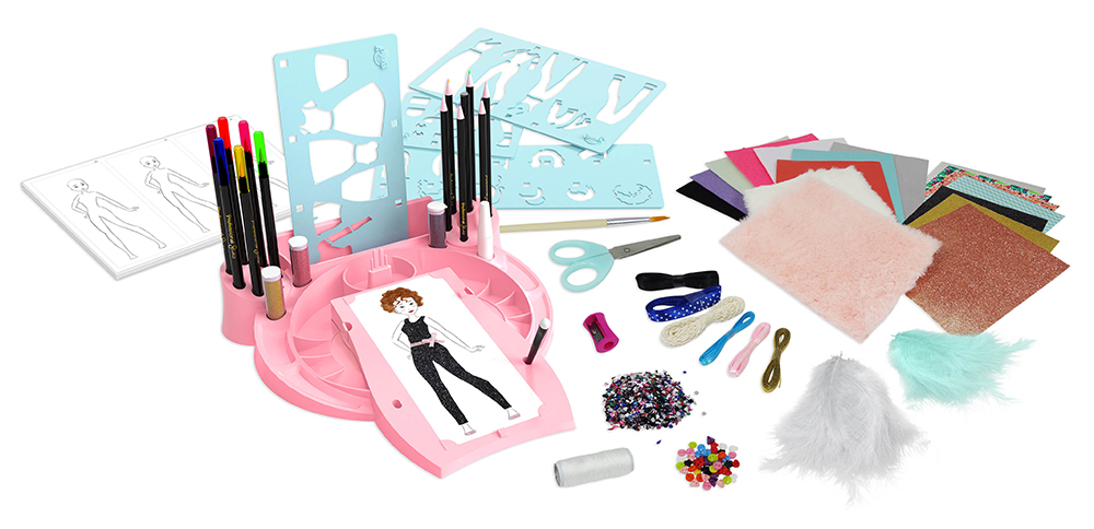 Place ta silhouette, dessine les tenues avec les pochoirs et donne leur du volume grâce aux nombreux accessoires inclus: tissu adhésif, plumes, paillettes, feutrine, rubans, feutres, crayons de couleurs aquarellables, ciseaux, taille-crayon.