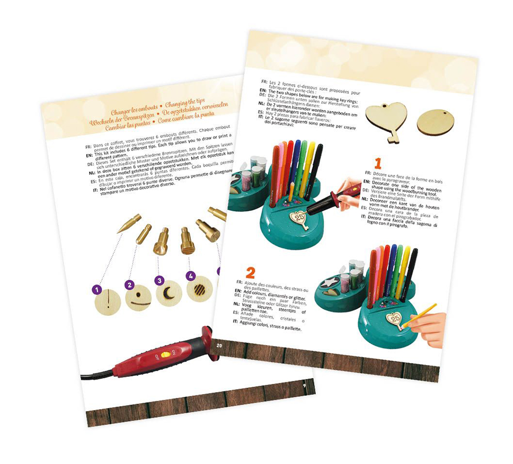 Un atelier sécurisé pour réaliser des gravures sur bois et métal. Crée et personnalise 5 aimants, 5 porte-clés, 10 colliers et 1 marque-page !