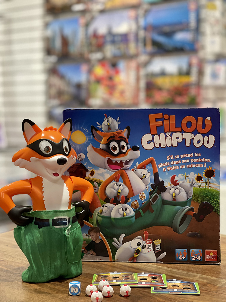 In the Filou Chiptou game, the greedy fox is snapping up the chickens and stuffing them into his pockets. But when there are too many chickens, his pants will fall down and the chickens will escape! Roll the die to see how many chickens to add into the fox’s pockets, and push his head one time. Before you know it, the fox will lose his pants and the chickens will roll everywhere! Rescue the chickens and return them to your chicken coop. Be the first player to fill up your coop to win! Can you Catch the Fox?