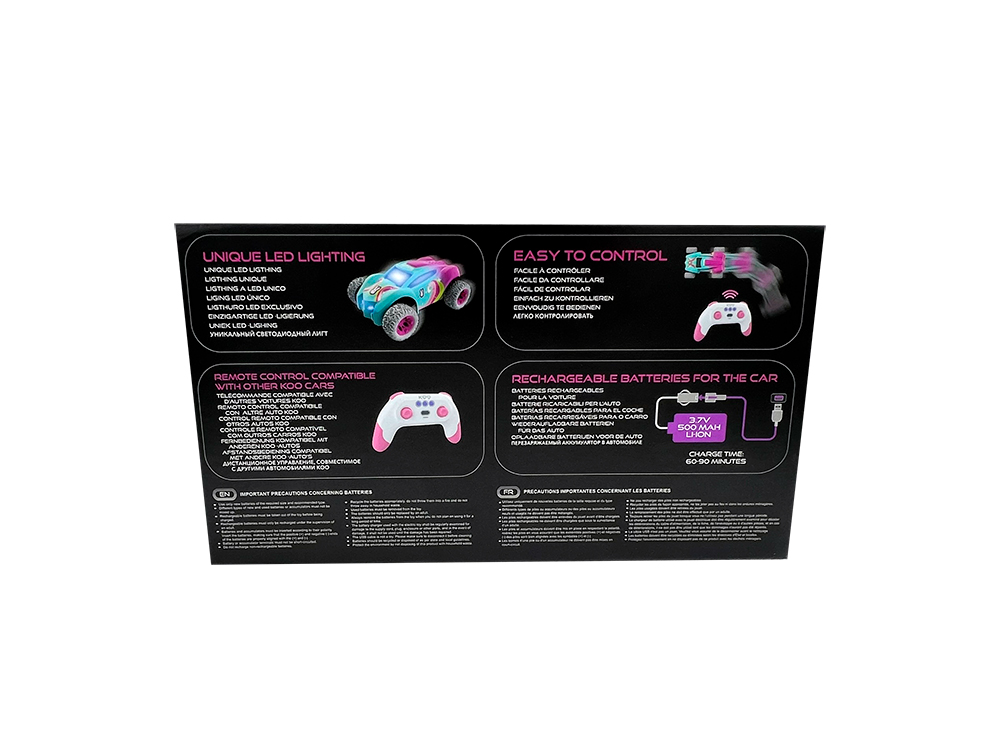 Look at the details of colors with this amazing gradient of pink and tiffany blue. Super easy to ride, it will impress your friends through the night with the powerful lights. This car is equipped with LED lights that give it a stunning look and enable it to drive even in the darkest of places. This car is very easy to drive. The balance between speed, weight and performance makes this car an ideal entry-level model for RC enthusiasts. The KOO stick 2.4 Ghz controller is universal and allow you to drive any KOO cars. Programable. You can record sequences of the car and replay them on command with the simple use of your remote control.