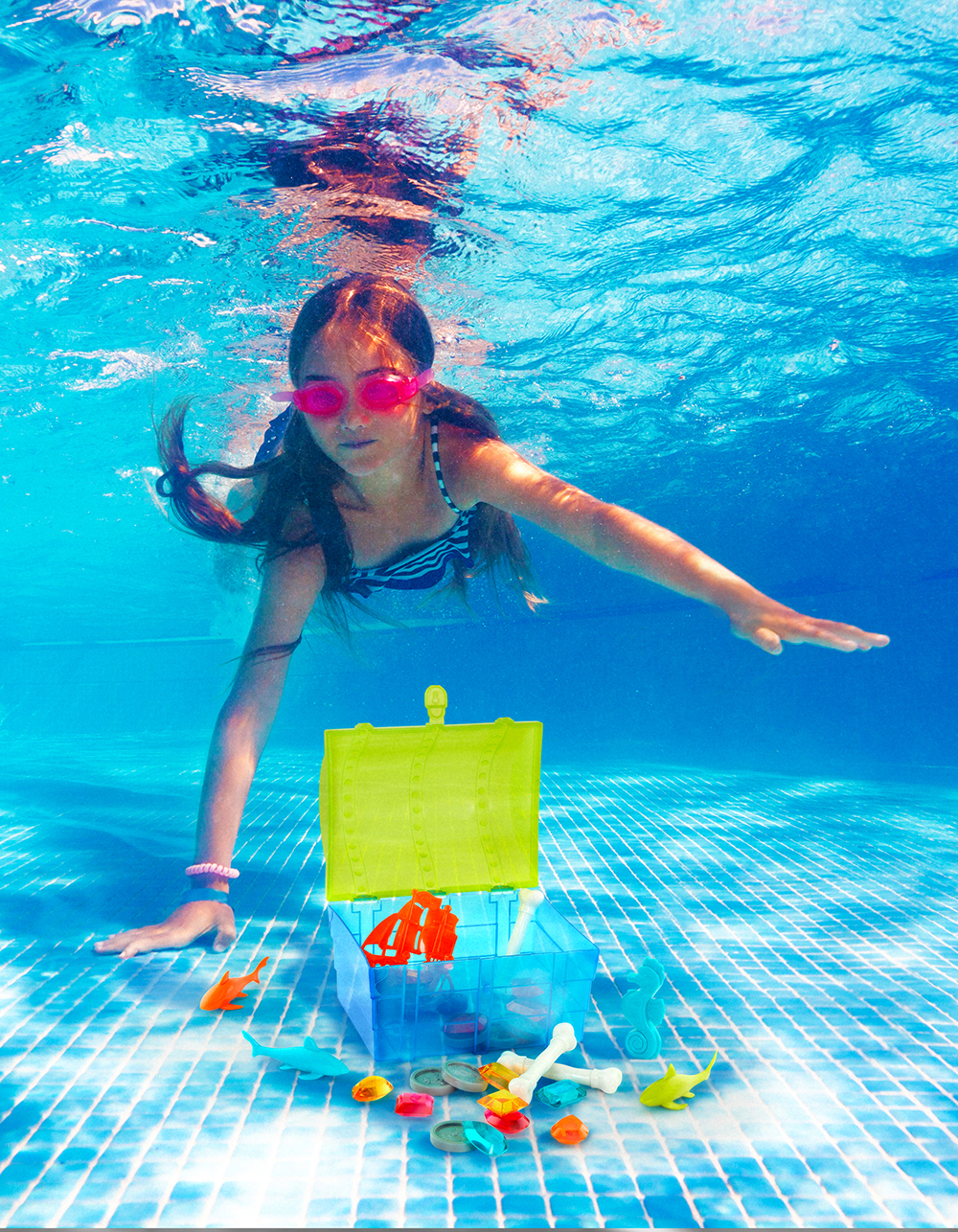 Plongez dans la piscine et voyez quel copain peut ramasser le plus gros trésor! Ce jeu de plongée Pirate de Battat est un coffre au trésor rempli de 27 jouets de piscine qui coulent. Des pierres précieuses, des diamants, des pièces de monnaie, des os, des hippocampes et des requins ! Ils descendent tous à des vitesses différentes. Alors, prenez les lunettes et jetez-les à l'eau. Regardez votre enfant devenir de plus en plus courageux à chaque fois qu'il plonge. Les motifs cool et amusants de ces jouets de natation colorés créent un paysage magnifique au fond de la piscine! Ce jouet de plongée favorise le jeu actif en été, aide à développer la coordination et améliore les compétences en natation. Fabriqué avec des matériaux de haute qualité sans BPA ni phtalates. Cet ensemble de jouets de piscine est recommandé pour les enfants de 8 ans et plus. Conforme ou supérieur aux normes de sécurité du Canada, des États-Unis et de l'Union européenne. La surveillance d'un adulte est requise en tout temps.