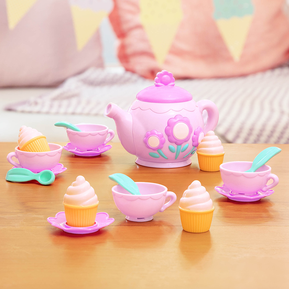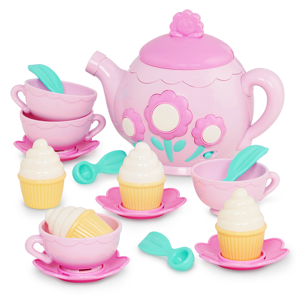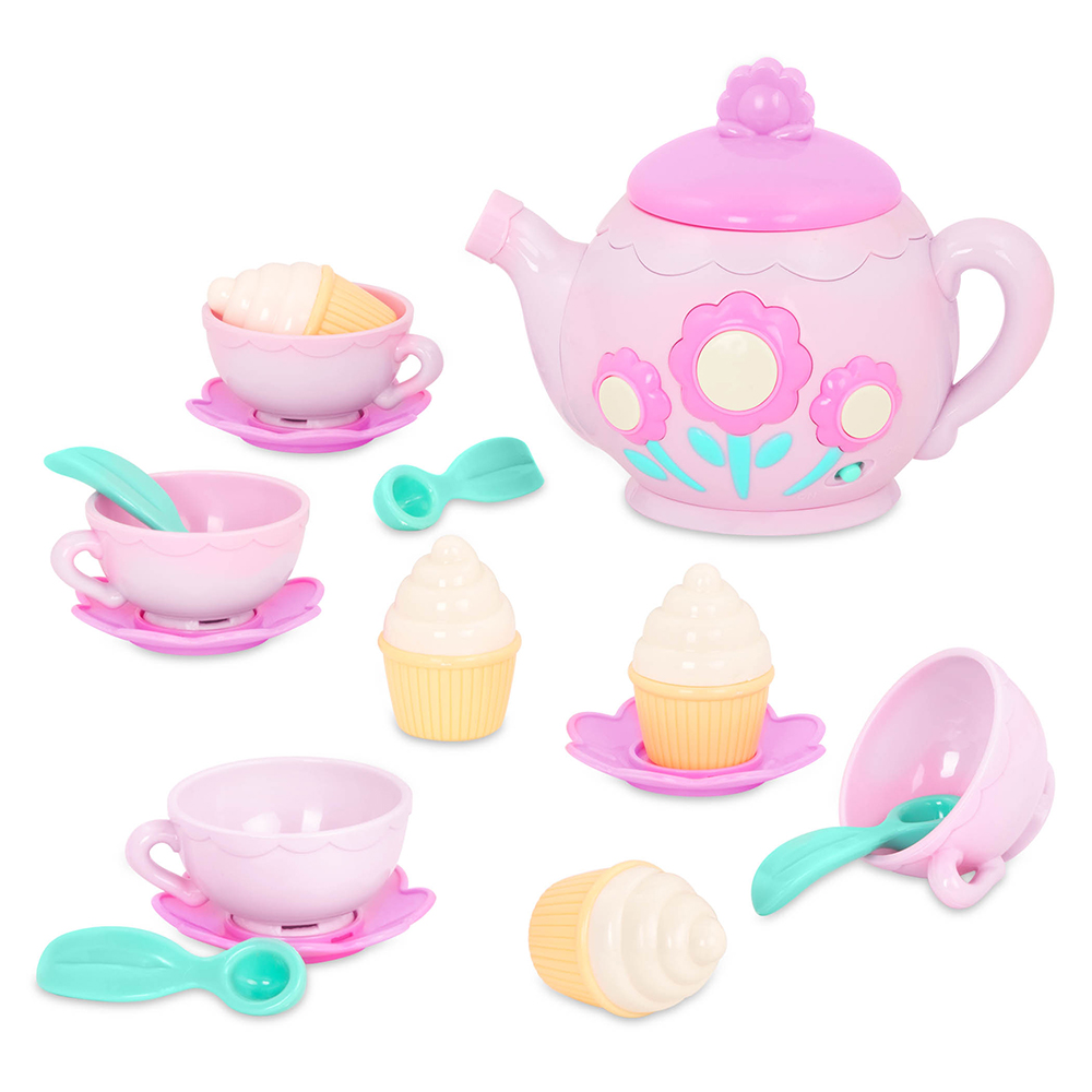 A charming musical tea set for sweet pretend play moments! This interactive tea party set features a musical teapot with realistic sounds and melodies, along with cups, saucers, spoons, and cakes for imaginative tea-time fun.