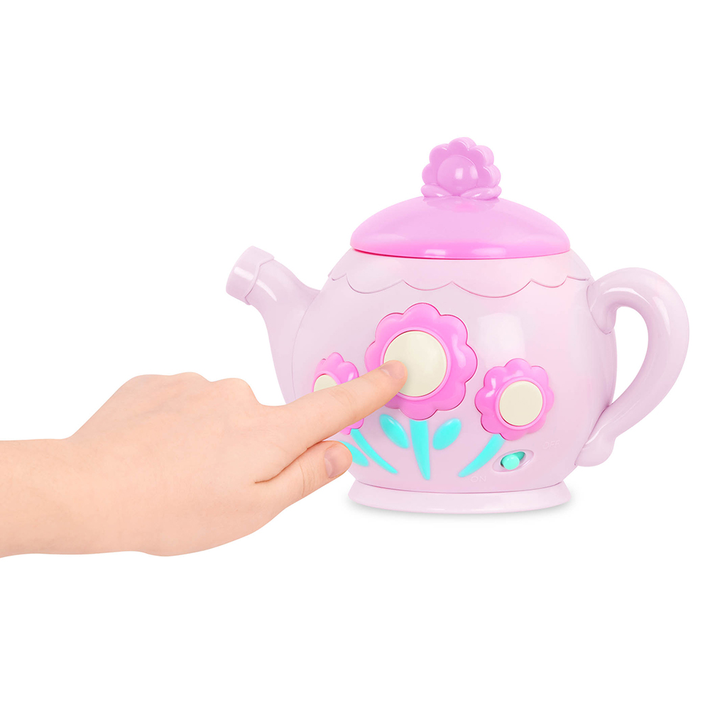 Press the buttons to play different tunes, lift the lid to hear boiling water, and close it to hear the teapot whistle.