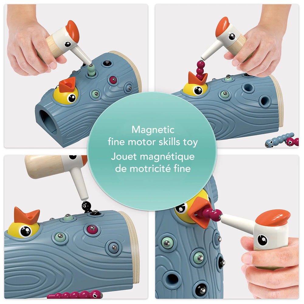 Feed the Woodpecker Game is an entertaining and educational toy that consists of a tree trunk with holes to insert worms and a large hole where the baby Woodpecker is placed to be fed. Not only is this game fun for kids, but it also helps them develop their hand-eye coordination. Children play the role of a bird mother and catch magnetic worms in a tree trunk to feed the baby bird. The game includes 8 worms, 4 of which are of different colors, providing a fun and interactive way for children to learn about colors and develop their motor skills. The Feed the Woodpecker Game is sure to provide hours of educational and enjoyable playtime for kids!