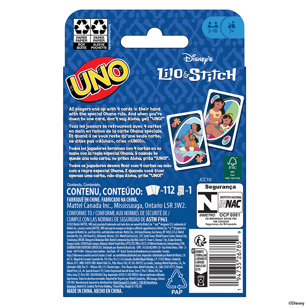 With a deck featuring graphics inspired by favorite characters and scenes, players try to match colors and numbers -- there's even a special 'Ohana' rule that ends up with all players having four cards in their hand! And when down to a last card, don't forget to yell 'UNO!' Makes a great gift for fans of Disney's Lilo and Stitch and card game lovers. Colors and decorations may vary.