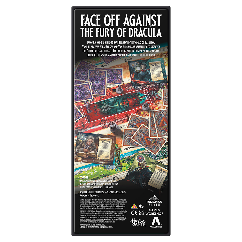 On affronte la fureur de Dracula ! Des créateurs du jeu Betrayal, l'extension Avalon Hill Talisman Sagas : La Couronne de Sang infuse l'horreur gothique au Talisman de base. Les joueurs peuvent choisir de jouer l'un des chasseurs de vampires Mina Harker et Van Helsing du Dracula de Bram Stoker. Puis ils embarquent pour un voyage dangereux rempli de nouveaux ennemis, événements et objets magiques. Tout cela pour enfin atteindre le Château de Dracula et être le premier à vaincre le Comte pour gagner ! Ou ils peuvent jouer au jeu de base sans le plateau Château de Dracula et incarner Dracula s'opposant au Crapaud-vampire. Cette extension introduit également des cartes Événement continu, une nouveauté qui change le jeu. (Nécessite le jeu Talisman 5e édition de base. Vendu séparément.)