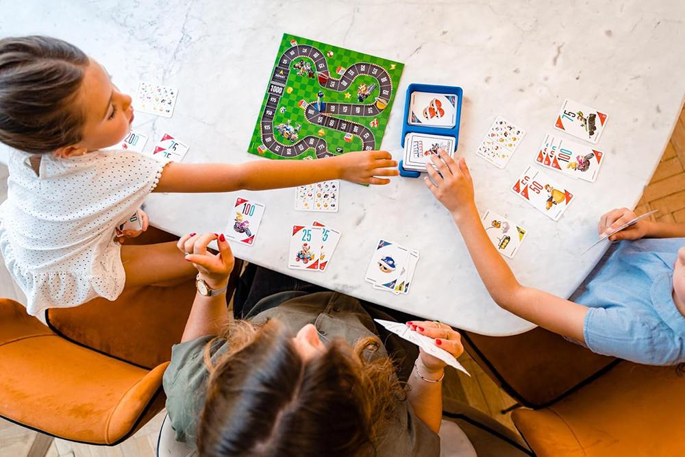 Jouez au célèbre jeu des 1000 km dans l'univers de Mario Kart. Choisissez votre personnage préféré de Mario Kart, comme Mario, Luigi ou Peach, et jouez des cartes de bornes pour faire la course autour de la piste. Mais en chemin, attention aux peaux de bananes et aux pièges de vos adversaires!
