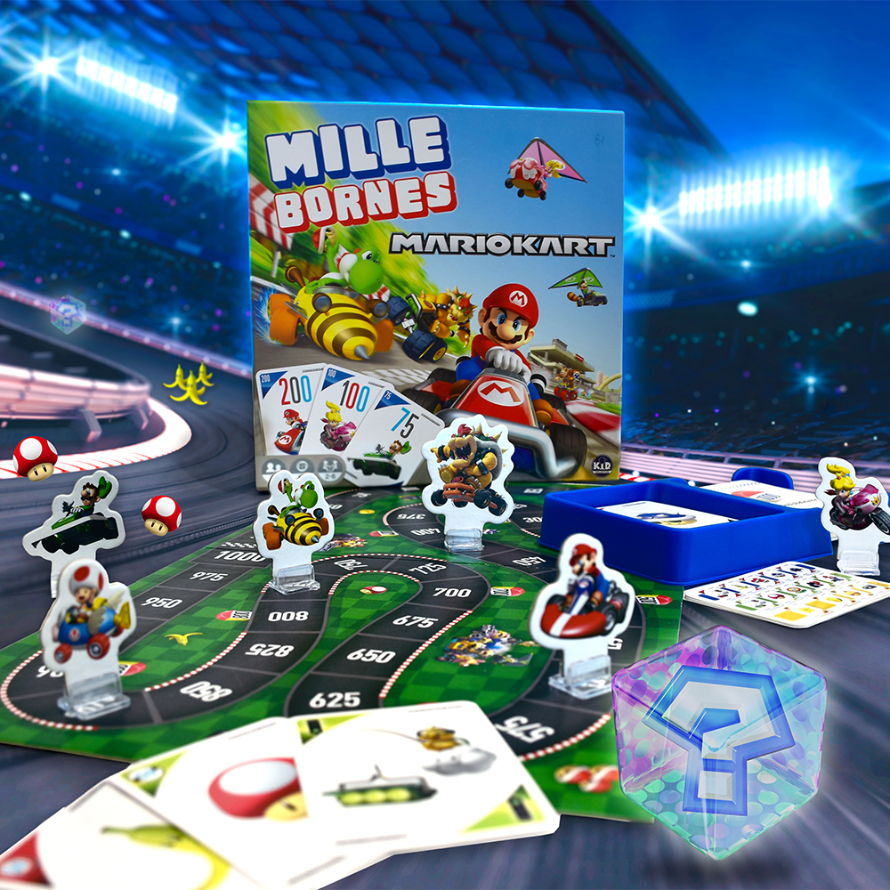Jouez au célèbre jeu des 1000 km dans l'univers de Mario Kart. Choisissez votre personnage préféré de Mario Kart, comme Mario, Luigi ou Peach, et jouez des cartes de bornes pour faire la course autour de la piste. Mais en chemin, attention aux peaux de bananes et aux pièges de vos adversaires!