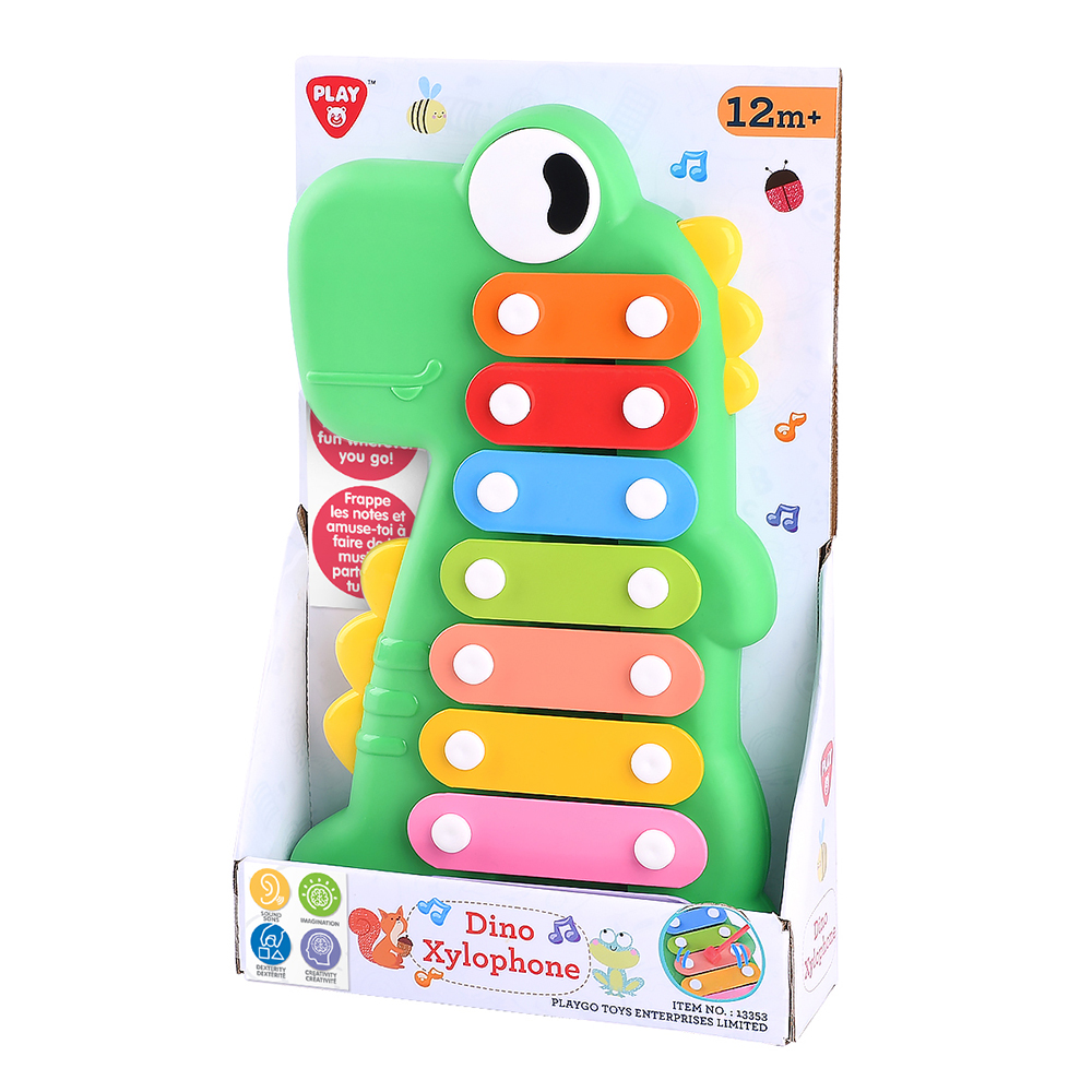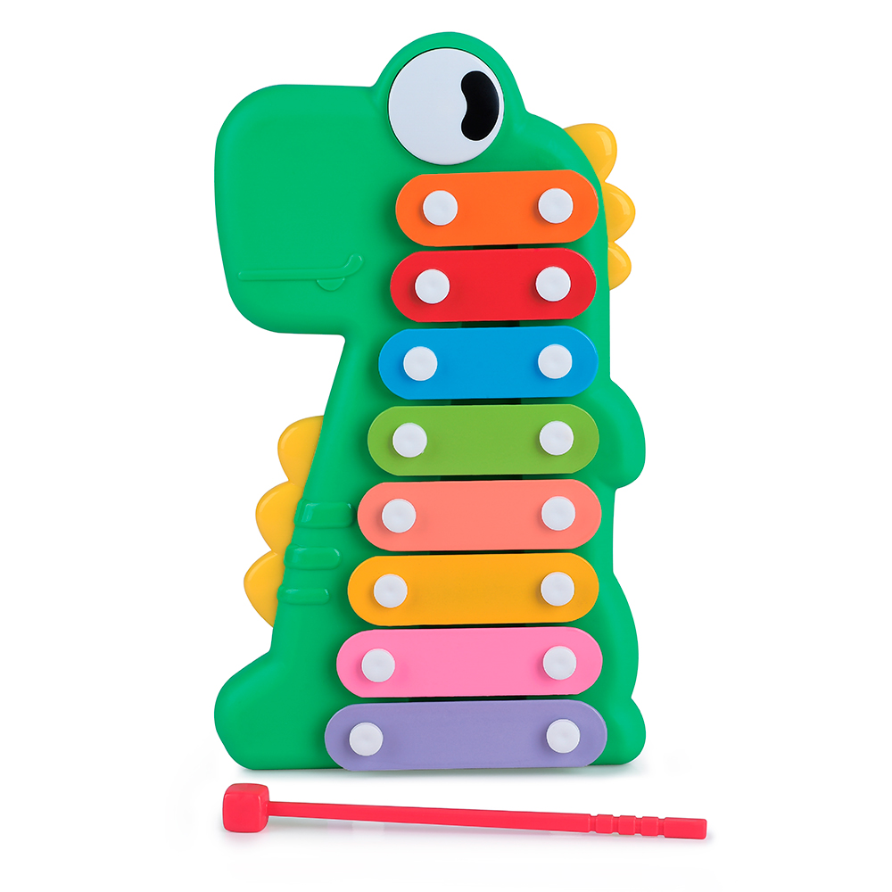 Colorful dinosaur-shaped musical toy, perfect for introducing young children to sound and rhythm.