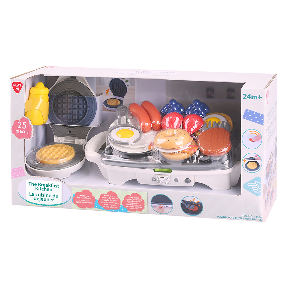 Cuisine à petit déjeuner électronique blanche comprenant 25 pièces, incluant un gaufrier et une plaque chauffante pour préparer de délicieux petits déjeuners imaginaires.