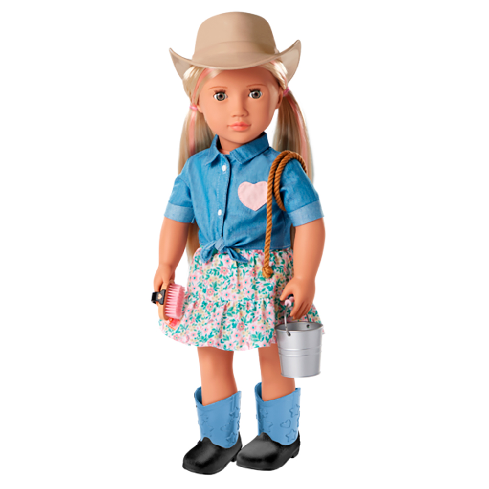 Elle rencontrera de nouveaux cousins, se fera de nouveaux amis animaux et devra également relever de nouveaux défis. Est-elle nerveuse? Pas question! Son opportunité est enfin arrivée, et rien ne se mettra en travers de son chemin - ni une oie méchante, ni un cheval effrayé, ni un grand-père aux opinions très tranchées. Vous êtes prêts pour la balade? Lainey porte une tenue de campagne élégante comprenant un haut de style jean avec un cœur rose et des détails noués sur le devant, une jupe fleurie, un chapeau de cow-boy et des bottes d'équitation bicolores ornées de cœurs et d'étoiles.