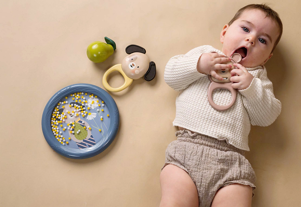 Each piece encourages sensory exploration and fine motor skills, crafted from baby-safe materials in soft, modern colors.