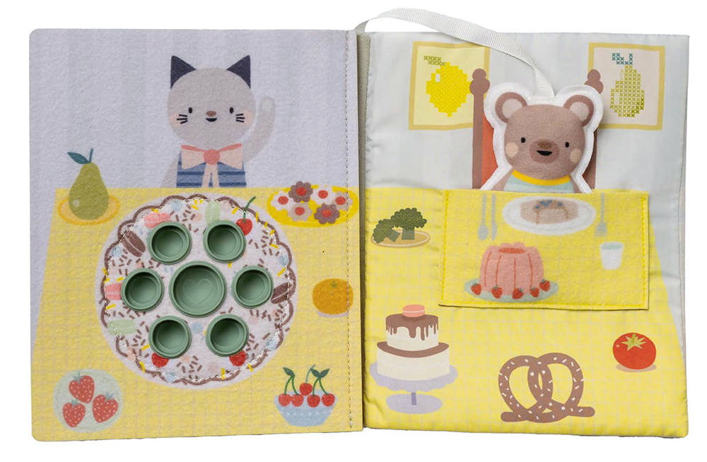 Chaque page propose une activité sensorielle : engrenages, matières texturées, volets surprises, horloge pop-it, poches ludiques, éléments à tirer ou à faire glisser, pour stimuler la motricité fine et le jeu imaginatif.