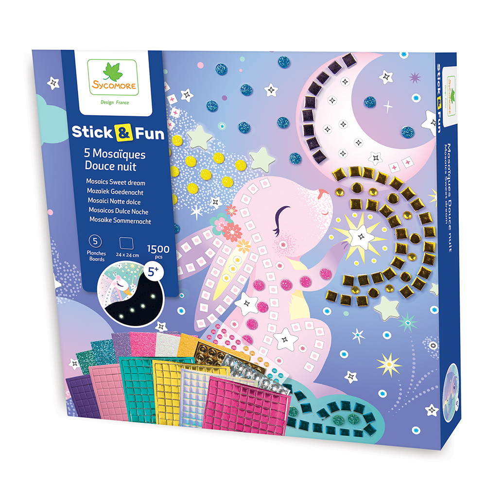 Réalise ces 5 tableaux sur le thème douce nuit en collant la mosaïque sur le graphisme correspondant, 2 rendus différents par tableau (à la lumière du jour et dans la nuit).