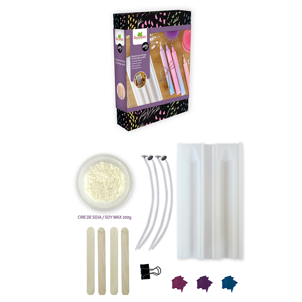 Includes : colored wax, wicks, molds, cups, spatula, and step-by-step instructions.