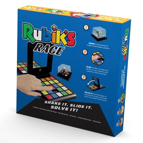 A strategy racing game like no other. Shake the scrambler and take your opponent on head to head. Shift and slide the tiles to become the first racer to complete the 3x3 center. Although it may sound easy, the Rubik’s Race board game is something of skill, speed and dexterity. Challenge your friends and family to the Rubik’s Race and come battle for the pole position. Can you handle the pressure of the Rubik’s Race?
