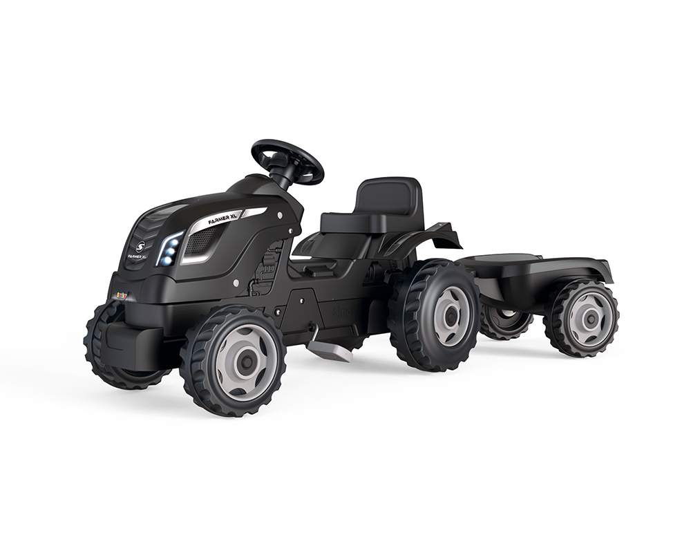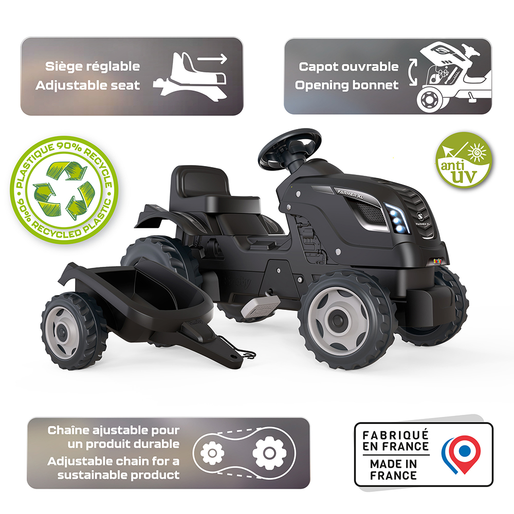 The Farmer XL Black Tractor with Trailer is a great toy for little aspiring farmers! This pedal tractor with removable trailer offers realistic looks so your child can immerse themselves in the farming world. The seat adjustment makes it easy to use for all children. Plus, the front hood opens and the steering wheel has a horn. Your child will love playing with this tractor and trailer, imagining exciting farm work scenarios!