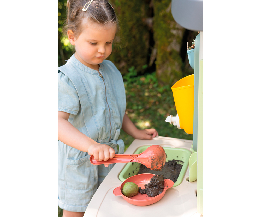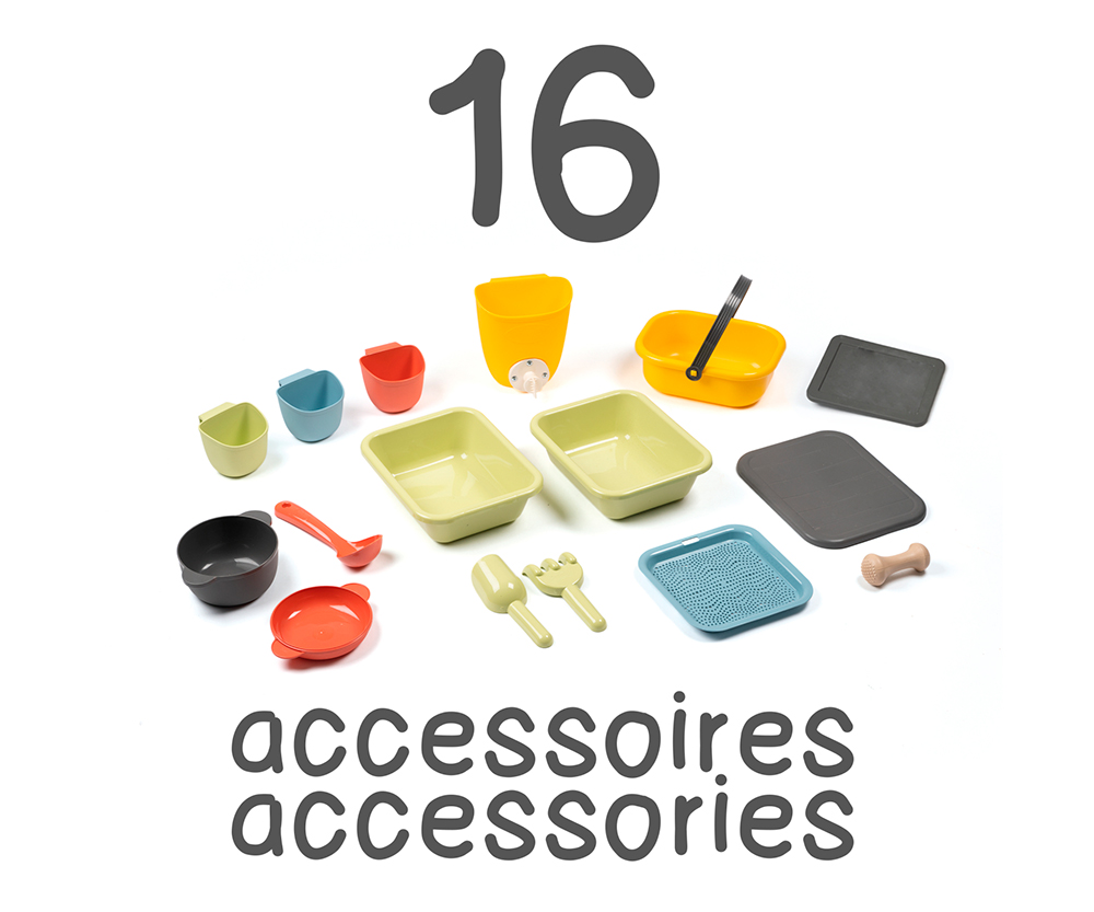 With 16 accessories and a large work surface, this playhouse will become your favorite playground! Start by gathering everything you need to cook: sand, flowers, branches, pebbles... You can even write the menu of the day on the slate! Once you've finished cooking, you can easily rinse your items as they are removable.