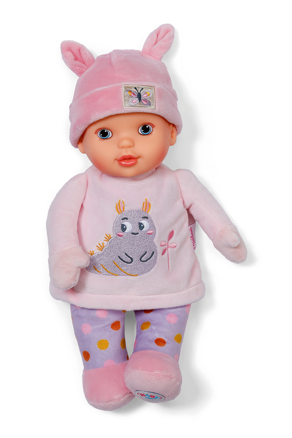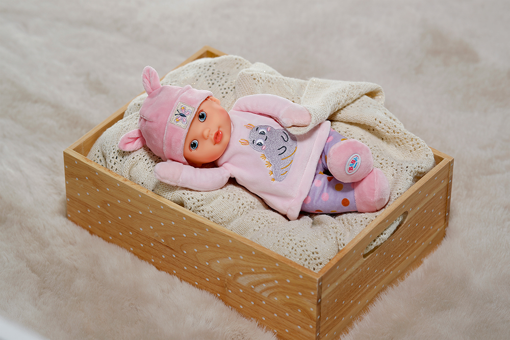 Sweetie Pink is a soft 30 cm cuddle doll, perfect for babies from birth. With a fabric body, vinyl head, and printed eyes, she is ideal for gentle cuddles.