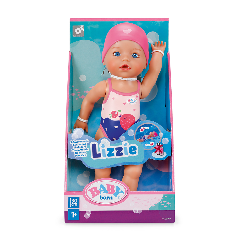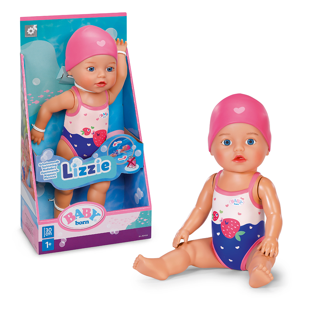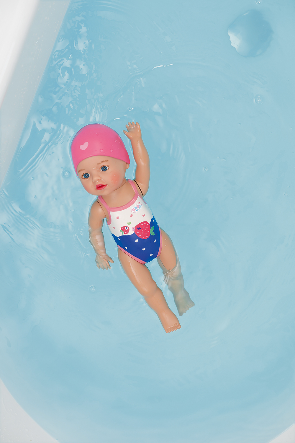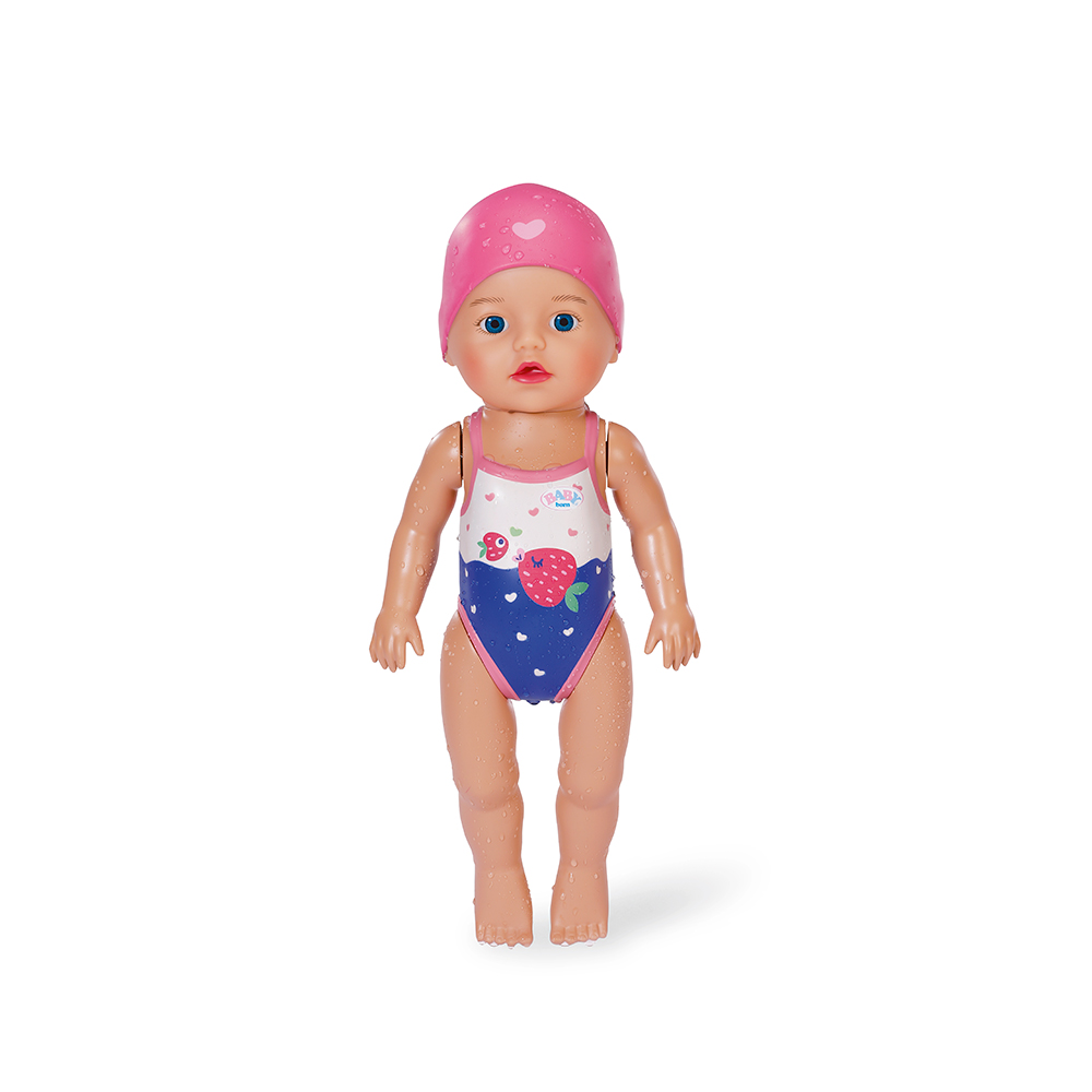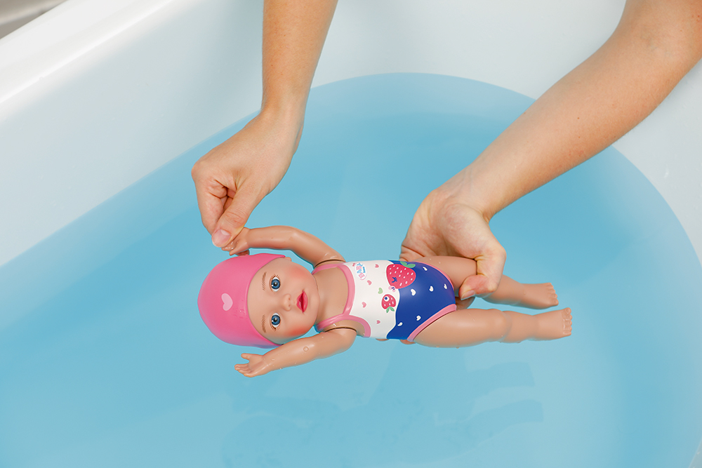 The little girl has learned so much already at her baby swim course. Her favourite strokes are crawl and butterfly. When she swims front crawl, she dips one arm into the water at a time; in butterfly both arms move at the same time – all without batteries! Winding the doll’s arms backwards gets her ready for her next lap. When her arms are released, she swims through the water. The legs and head of the “little dolphin” are also mobile, so the Swim Girl can sit on the edge of the pool and watch mummy and daddy swim. Her cute swimsuit with Berta the Duck motif and fun ruffles and her swimming hat are printed on the body as a relief.