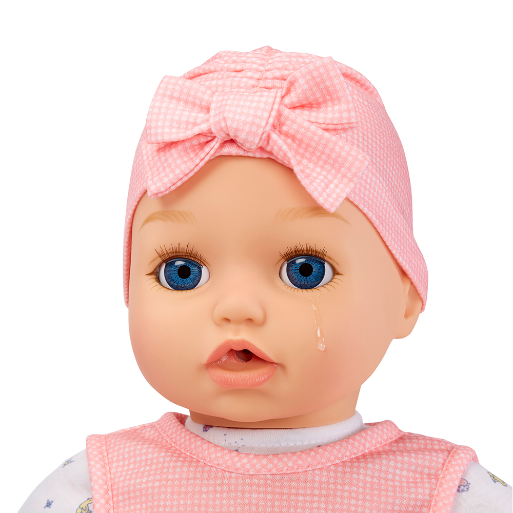 BABY born Ma vraie poupée de bébé aux yeux bleus est une poupée de 43 cm avec un corps souple et des traits réalistes. Elle émet des sons de bébé, bouge la bouche avec un biberon ou une suce, verse de vraies larmes, fait pipi et ronfle quand on la berce.