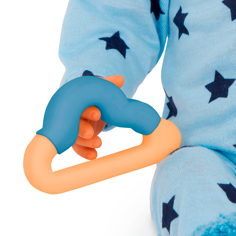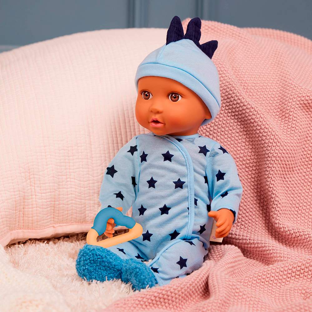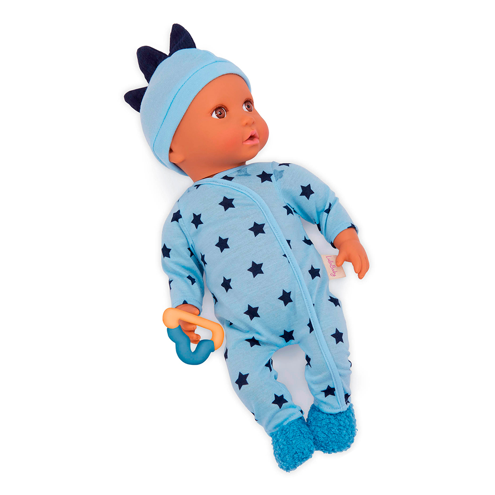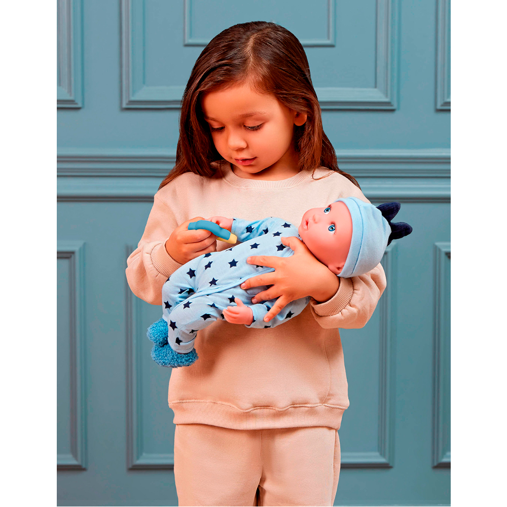 It's getting late, it's time to go to bed! Baby puts on a comfortable blue night-time outfit with star print. For added comfort, put on baby's beanie and slippers and let sleep take over his pretty eyes!