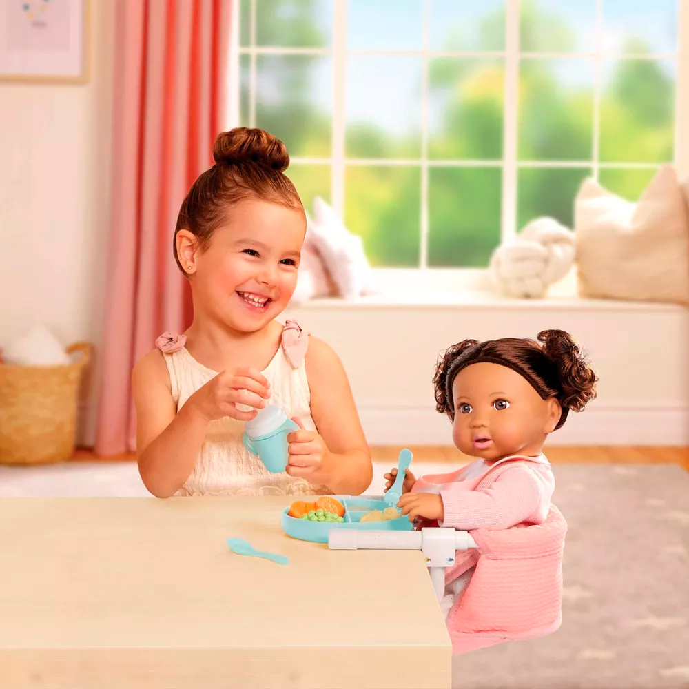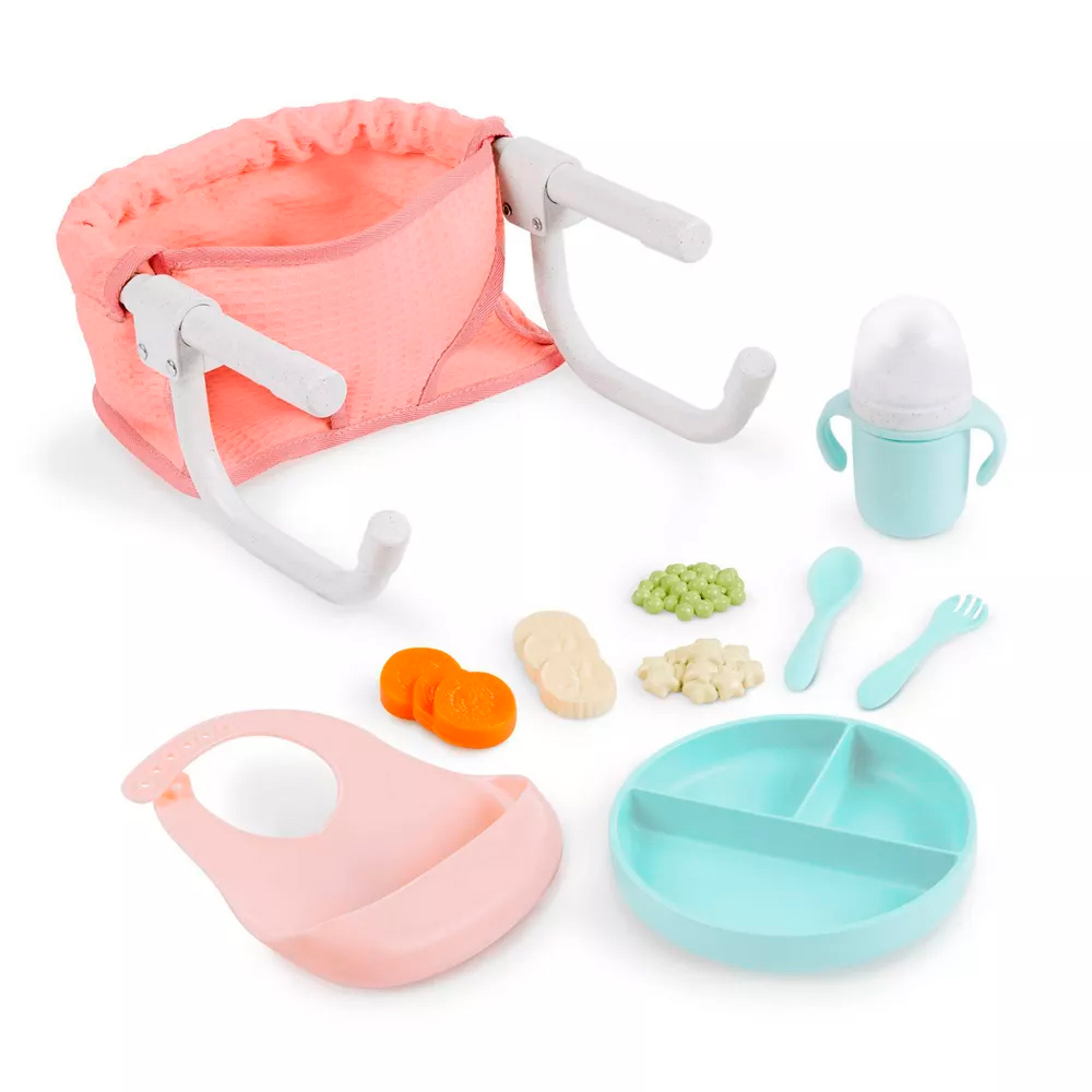 Put your favorite doll right next to you with the “LullaBaby” Clip-on chair! This adorable set includes a chair that can be hung on the table to involve the doll in imaginary meals, a bib to keep her clean, as well as a plate filled with pretend food, a fork, a spoon and a drinking bottle to make the doll “drink”. Perfect for children aged 2 and over, this kit encourages role-play and the development of imagination.