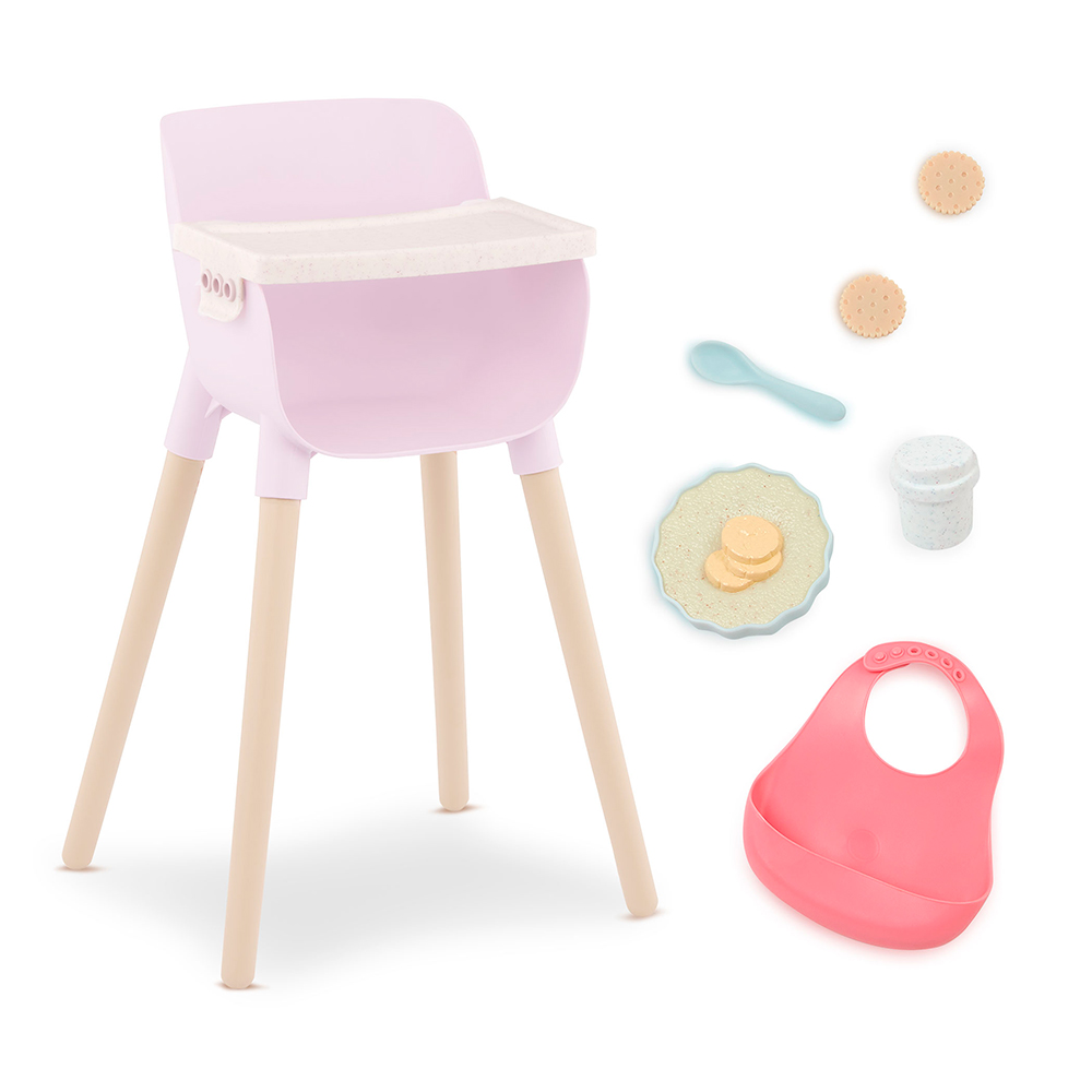 Designed in a soft speckled pink color, the high chair comes together in 2 easy steps. Just insert the chair legs and clip-in the food tray. Kids can seat baby doll inside and start feeding them with the cute play food items. It includes fun role-play accessories like 2 cookies, a sippy cup with a removable lid, a spoon, a detailed bowl of oatmeal with bananas, an attachable bib, and a teether. Plus, the food tray holds every accessory. So little hands will have every play piece at the ready. Measures about 18.5” (H) x 9.75” (W) x 11.25” (L), making it a lovely addition to toy nurseries and play spaces. LullaBaby dolls and accessories are the perfect gift for kids ages 2 years old and up, teaching empathy, kindness, and caring qualities. Compatible with most 14-inch baby dolls and accessories.