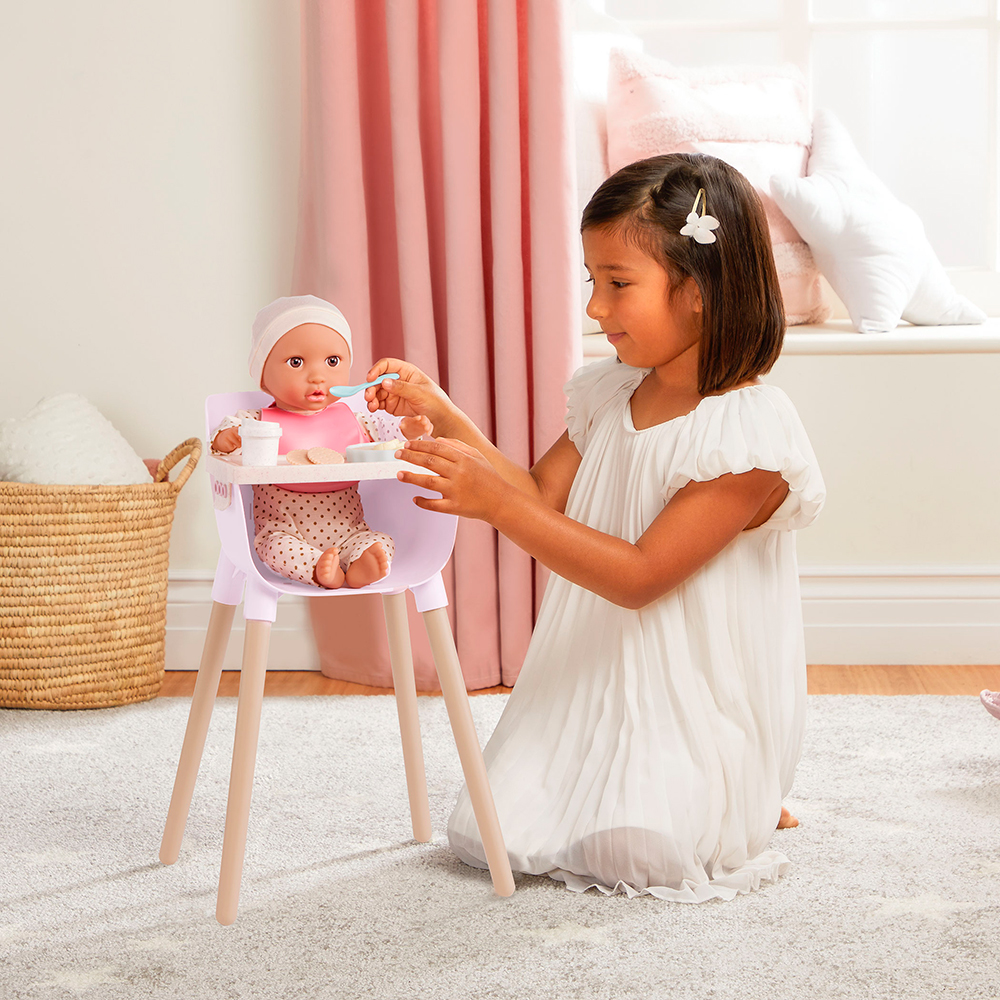 Les jeunes parents peuvent préparer leur poupée pour un repas amusant grâce à la chaise haute et au set de repas LullaBaby.