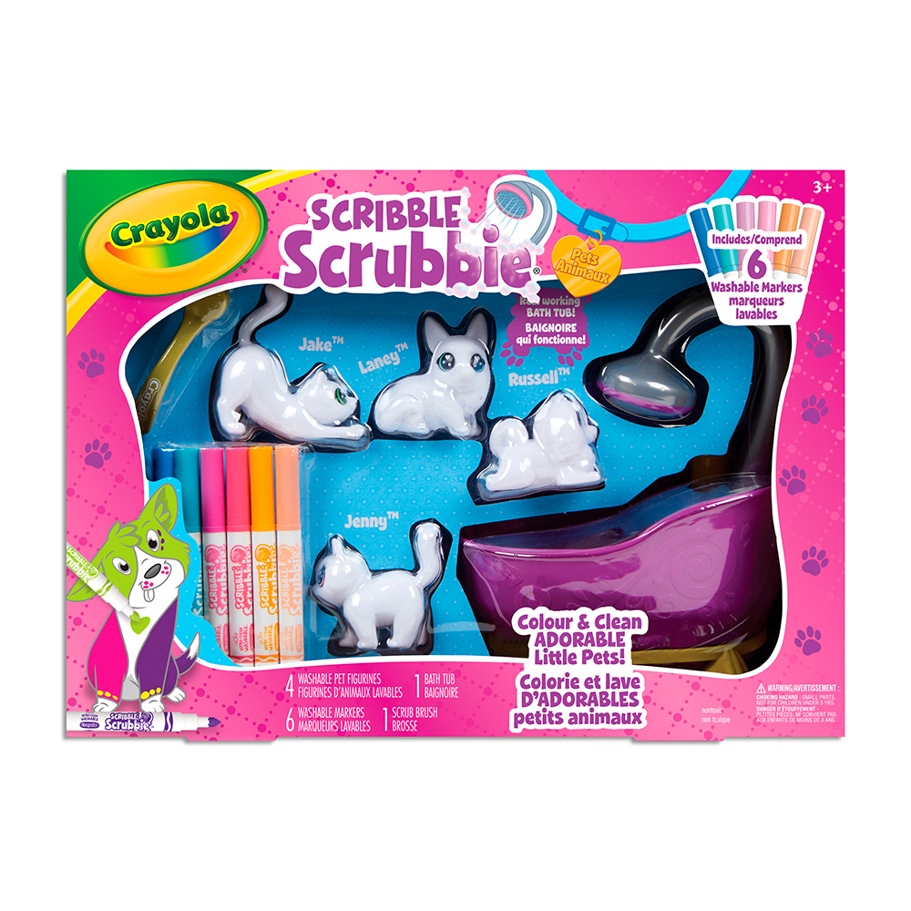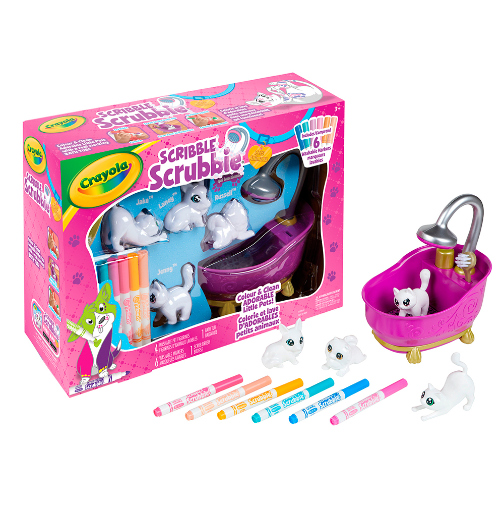 Crayola Scribble Scrubbie animals are adorable figures to color and wash, which aspiring little groomers can customize as they please! Choose a dog or cuddle a kitten and color them with the 6 included washable Scribble Scrubbie markers. And when you're ready to do something else, immerse them in the Scrubbie bathtub to wash them. Create new colorful coats as often as you like! Includes 4 Scribble Scrubbie pets.