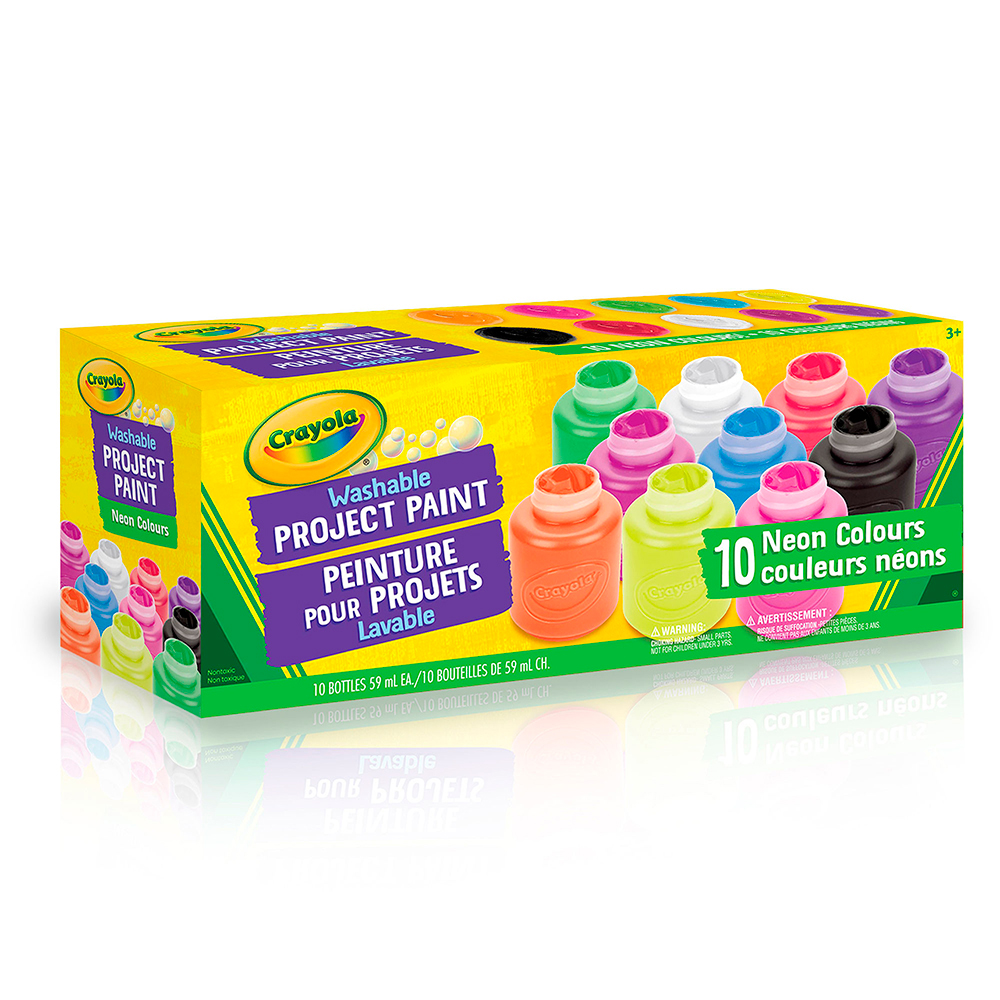 Includes 10 - 59 ml bottles of washable paint in assorted neon colours