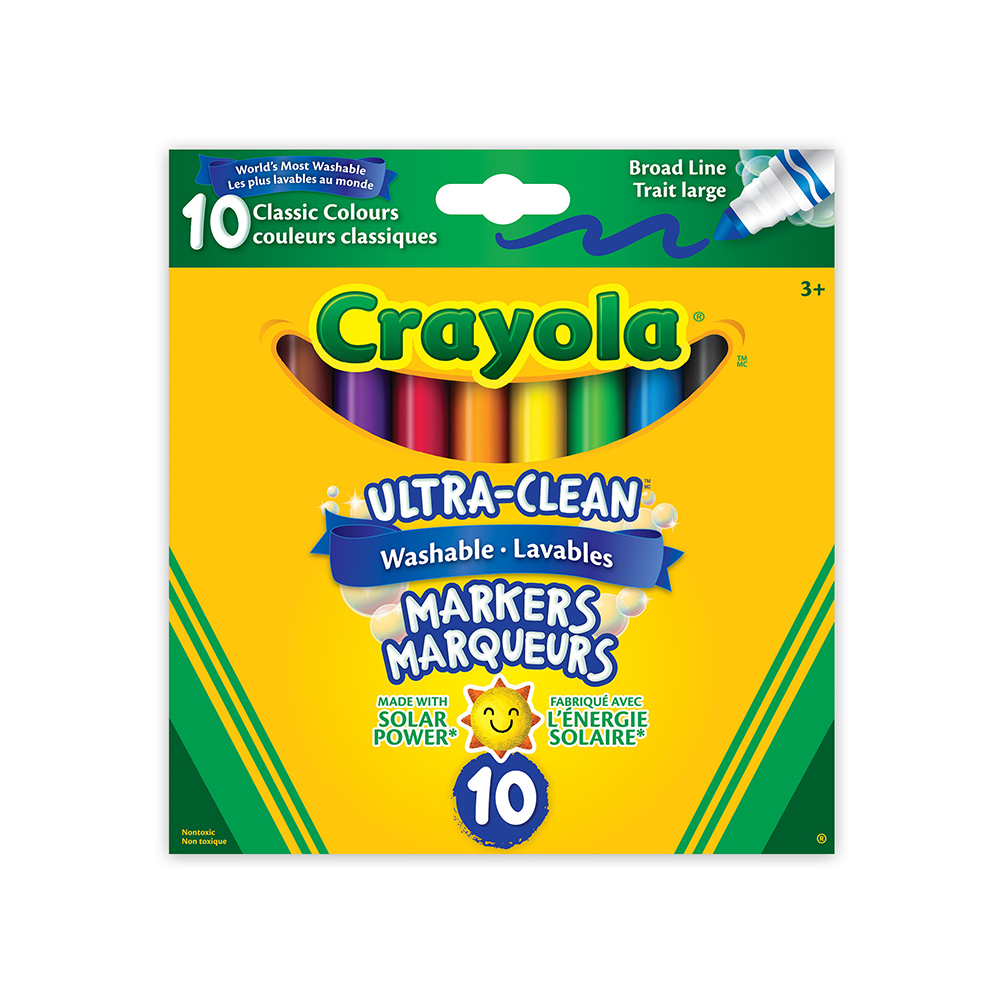 10 ct. Crayola Ultra-Clean Washable Broad Line Markers are specially formulated to have bright, vivid colours with a truly washable formula that easily washes off walls with warm water and a sponge.