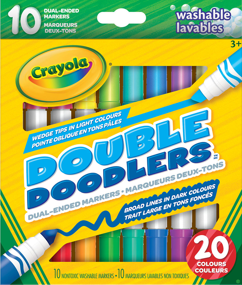 Crayola Double Doodler Markers are double the fun! Each marker comes with two complimentary colours for a total of 20 colours. Each marker is dual-ended featuring a broad line tip marker on one end and a wedge tip marker on the other end to provide just the right amount of colour for large or small spaces. These markers lay down plenty of colour and won’t smudge or bleed through paper. Unleash creativity and amp up school projects and artistic endeavours with vibrant high-quality ink that is true to colour. With these markers children can express, create, and connect with colour. Watch kids' confidence and independence grow as they learn through colourful play.