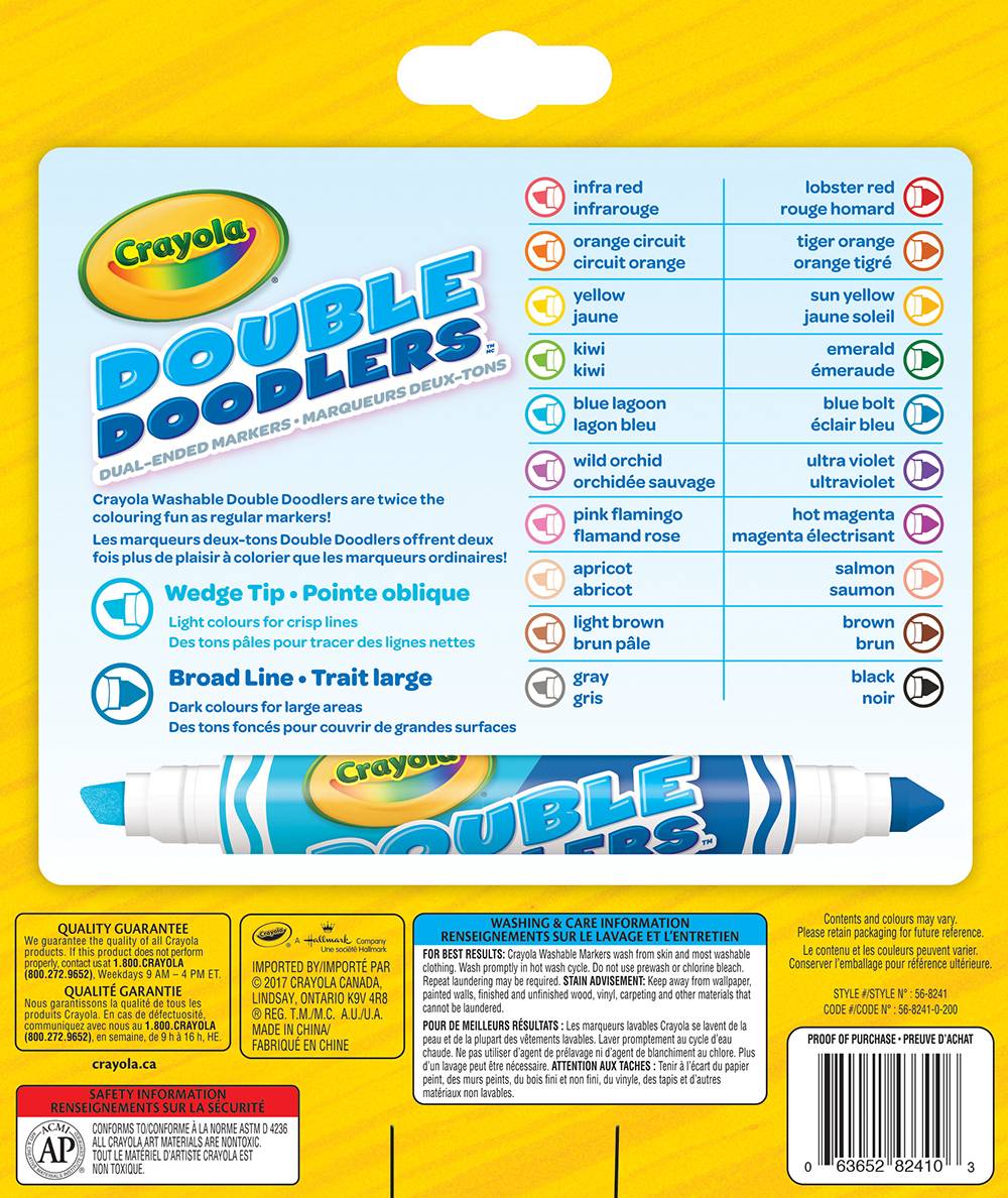 Les marqueurs deux-tons Double Doodlers offrent deux fois plus de plaisir à colorier que les marqueurs ordinaires! Chaque marqueur propose deux couleurs pour un total de 20 couleurs. Chaque marqueur à pointe double offre un marqueur à trait large et un marqueur à pointe oblique pour fournir précisément la quantité de couleur voulue pour les grands ou les petits espaces. Ces marqueurs déposent beaucoup de couleurs sans barbouiller ni traverser le papier. Donnez libre cours à la créativité et rehaussez les projets scolaires et les projets artistiques avec de l'encre vibrante de haute qualité fidèle à la couleur. Avec ces marqueurs, les enfants peuvent s'exprimer, créer et interagir avec la couleur. Voyez la confiance et l'indépendance des enfants grandir au fur et à mesure qu'ils apprennent en jouant avec la couleur.