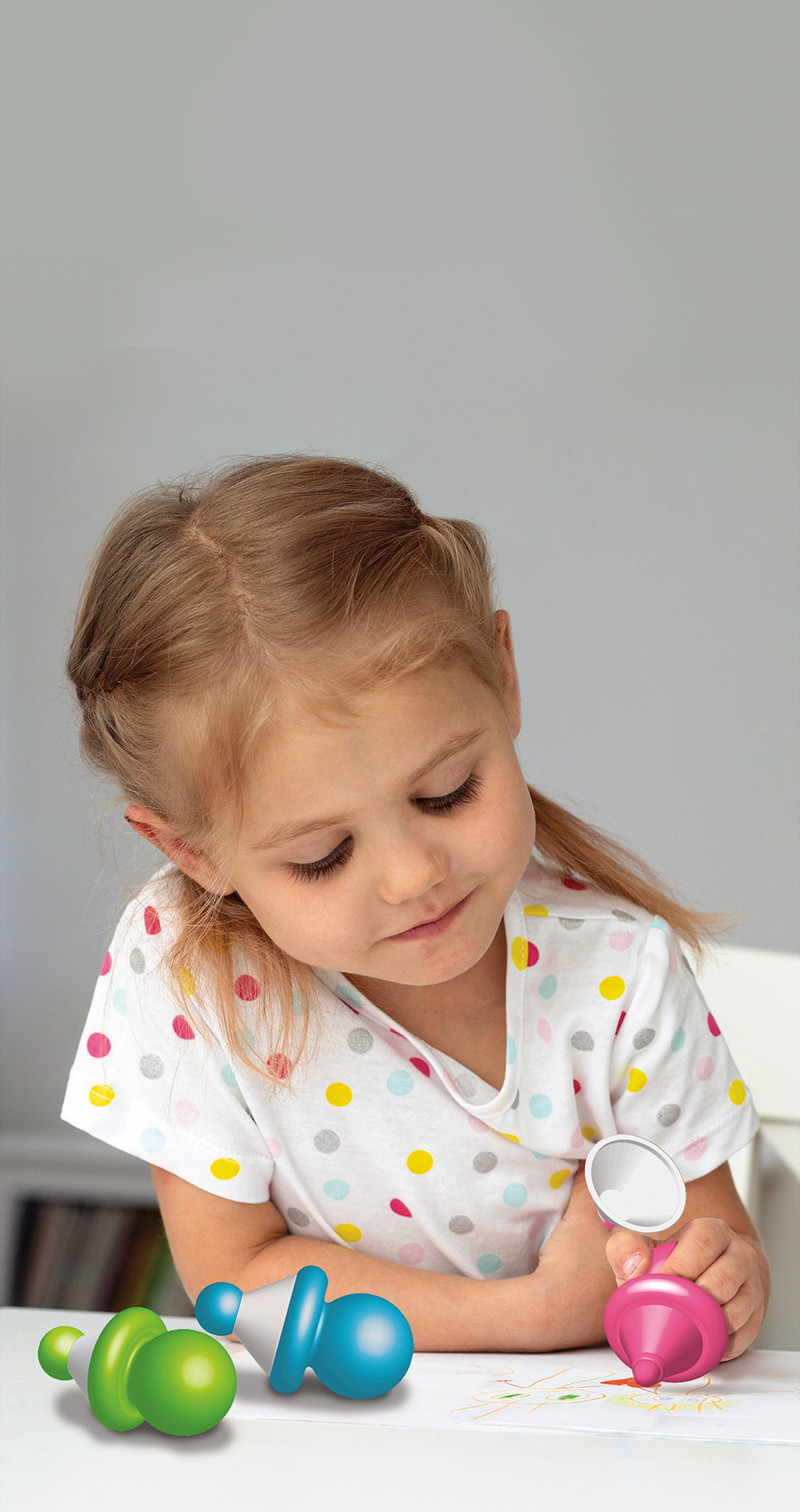 Set of 5 ergonomic markers for toddlers. These 5 markers in different colors are washable and easy to hold in the hand with their rounded grip.
