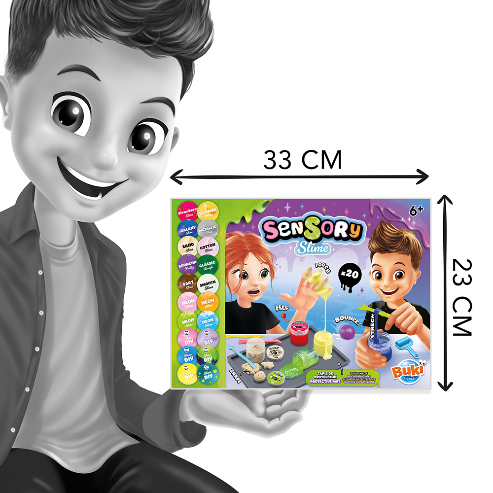 20 slimes to discover: jumping, glowing, neon, cotton, metallic, galaxy… Create mixtures easily by adding water to pre-measured beakers. Use the tools to shape, knead and mix your slimes.
