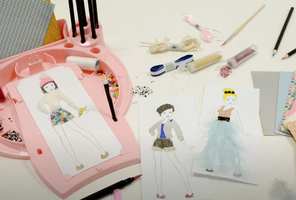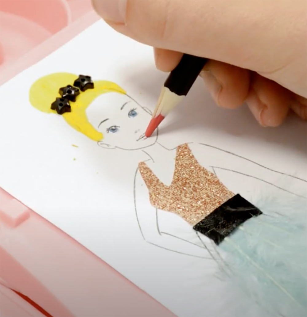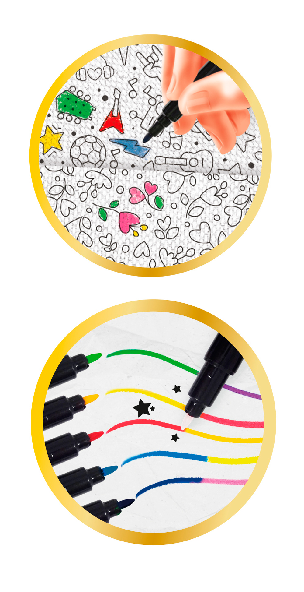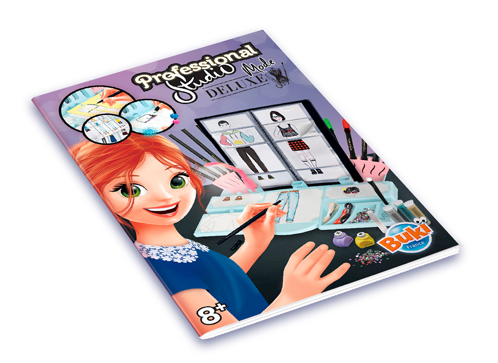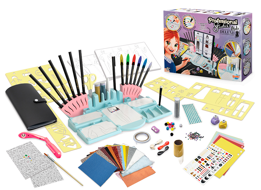 Many different accessories: magic felt-tips, self-adhesive fabrics, self-adhesive fabrics you can colour, water-colour pencils, LED light, 2 hole-punches, diamanté, ribbons and much more! Instruction sheet with colour illustrations.