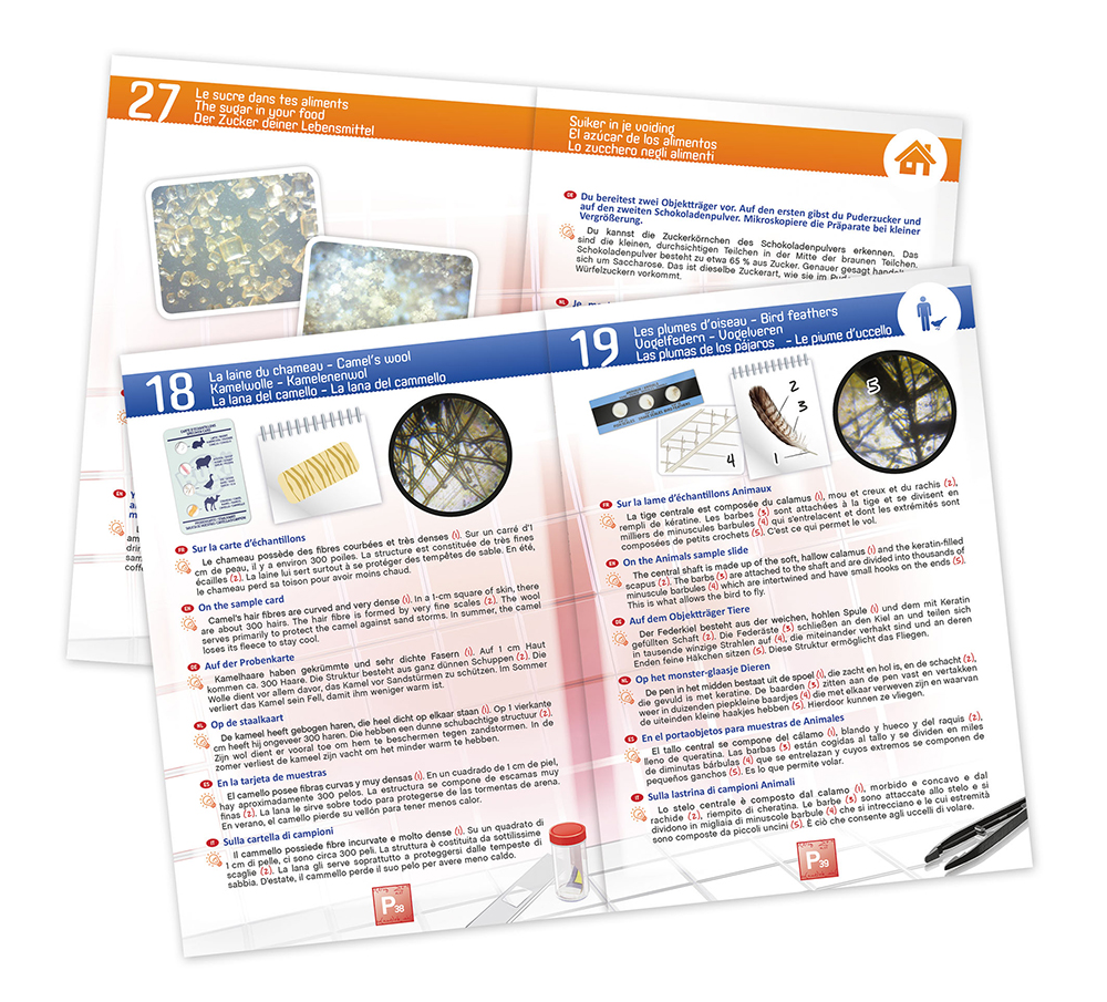 Feuille d'instructions disponible en 6 langues avec 30 expériences pour apprendre à préparer des lames, à prélever des échantillons, à ajuster le microscope et la lumière.