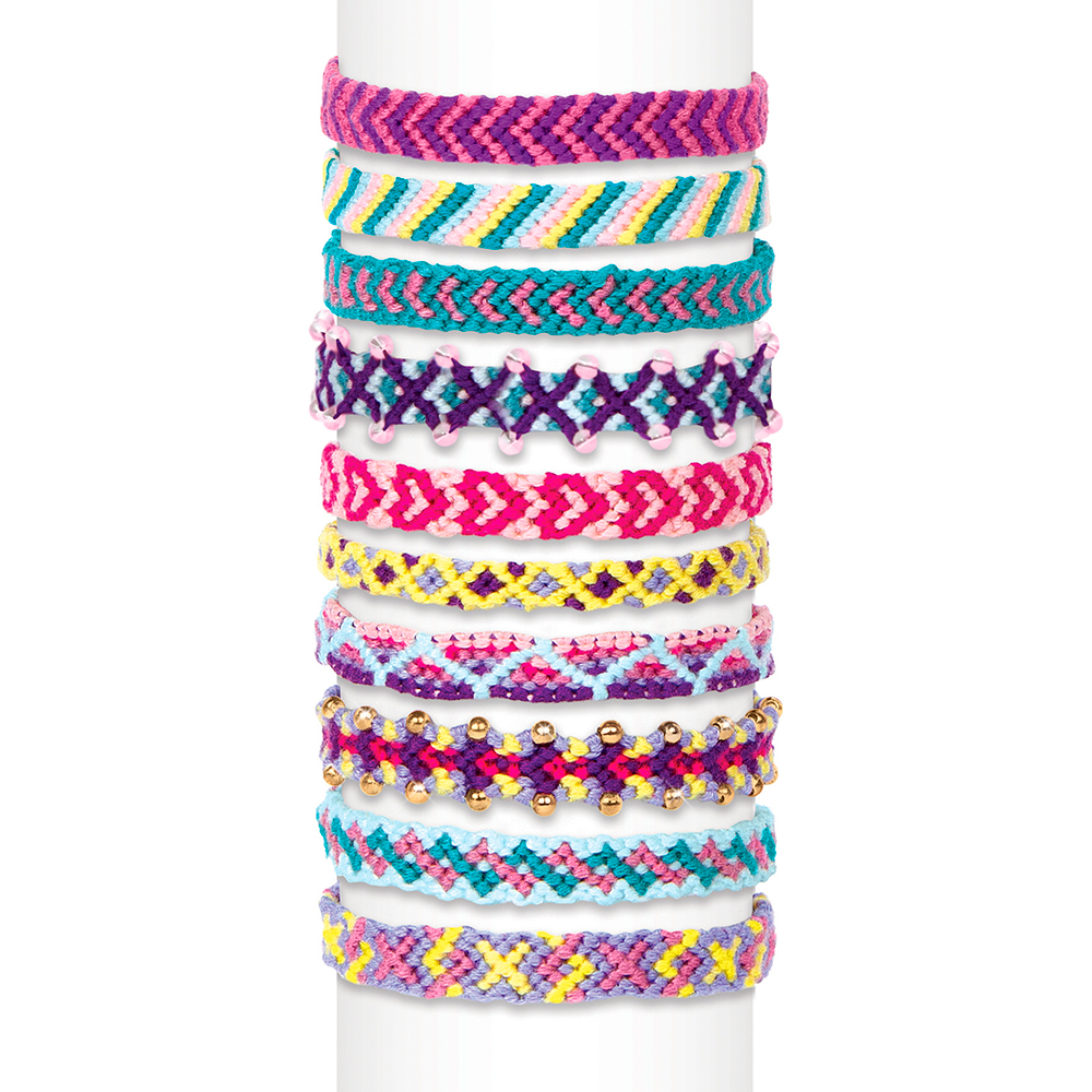 Comprend : 1 fabrique de bracelets d'amitié, 10 modèles de bracelets d'amitié, 3 fils de couleur 22 m, 3 fils de couleur 18 m, 2 fils de couleur 13 m, 60 perles assorties, 20 boutons, 1 feuille d'instructions.